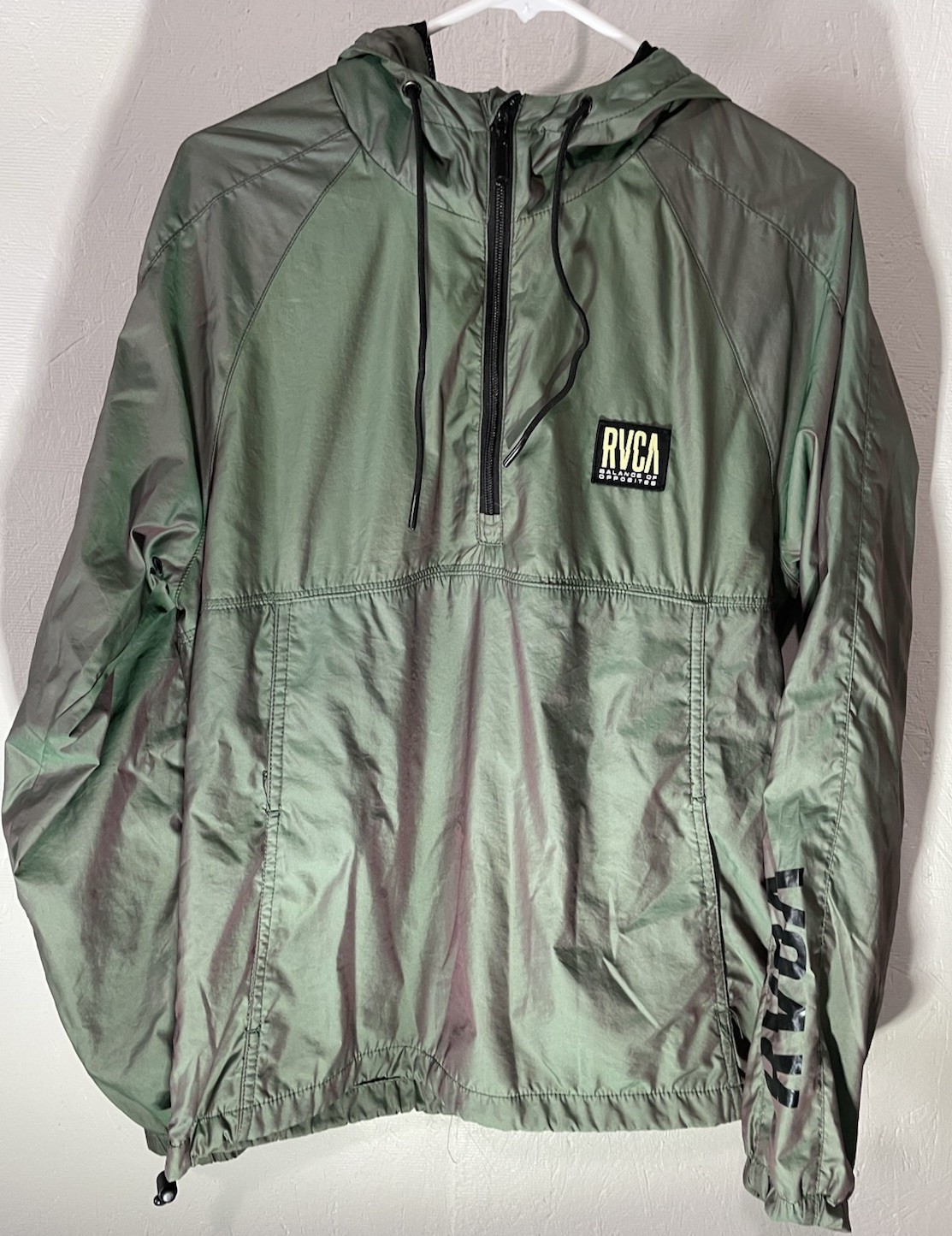 The RVCA Men's Hazed Iridescent 1/2-Zip Hooded Jacket in size small is a stylish and versatile outerwear option for men. Made from durable polyamide with a polyester lining, this mid-length jacket features a green iridescent pattern that adds a unique touch to any casual outfit. With a zip closure and hood, it is perfect for outdoor activities in all seasons, providing both comfort and protection. The lightweight design and canvas fabric make it suitable for everyday wear, while the pockets add functionality for added convenience.