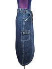 R.V.T Dark Wash Cargo Denim Maxi Jean Skirt Y2K Baggy Style Size 5/6 Women's C58 In excellent condition R.V.T Dark Wash Cargo Denim Maxi Jean Skirt Y2K Baggy Style Size 5/6 Women's. A true wear-with-everything classic, this timeless style pairs perfectly with your favorite tee or strappy tank for endless ways to wear. Features dark wash denim cargo maxi jean skirt, a-line silhouette, rigid denim, zip fly with button closure, 2 front slip pockets, 1 side cargo pocket with flap, 1 back pocket with flap, seam at front, back slit, belt loops, high waisted, Y2K style, baggy slouchy look, 90s jean skirt. Measurements laying flat waist 14" hips 19.5" length 33.5" Fabric 100% cotton This is a pre-owned item that may show signs of wear. In excellent condition, no flaws.