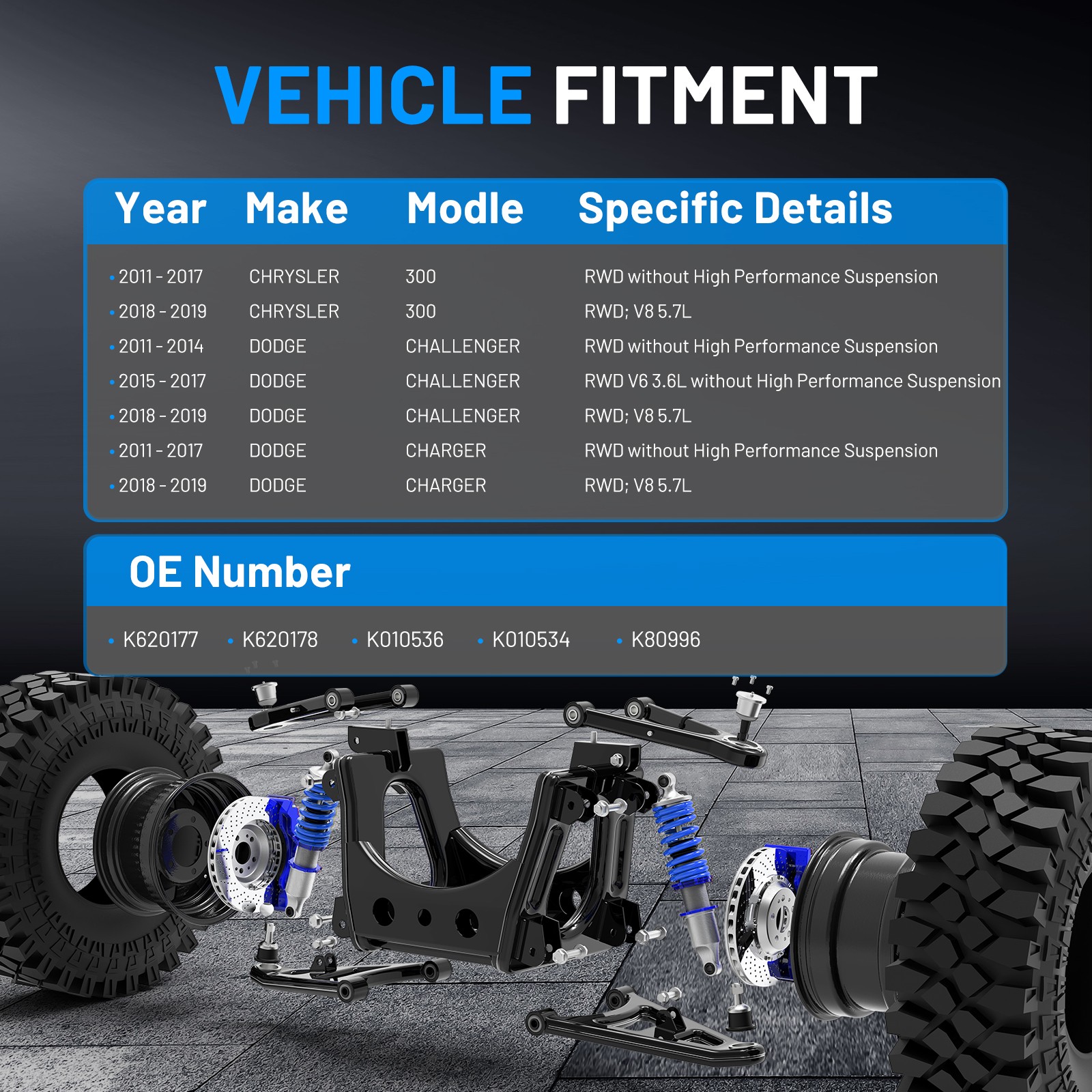 Specifications: 1. Placement on Vehicle: Front, Left, Lower, Right, Upper 2.OE/Part number: K620177, K620178, K010536, K010535, K010534, K80996 Package Includes: 1x Front Lower Left Control Arm Assembly - K620334 1x Front Lower Right Control Arm Assembly - K620333 1x Front Driver Side Lower Ball Joint - K90346 1x Front Passenger Side Lower Ball Joint - K90347 2x Front Driver and Passenger Side Inner Tie Rod Ends - EV420 1x Front Driver Side Outer Tie Rod End - ES3600 1x Front Passenger Side Outer Tie Rod End - ES3601 2x Tie Rod Boots + Bellows w/Locking C-Clamps 2x Front Stabilizer / Sway Bar End Links - K90344 Specifications: 1. Placement on Vehicle: Front, Left, Lower, Right, Upper 2.OE/Part number: K620177, K620178, K010536, K010535, K010534, K80996 Package Includes: 1x Front Lower Left Control Arm Assembly - K620334 1x Front Lower Right Control Arm Assembly - K620333 1x Front Driver Side Lower Ball Joint - K90346 1x Front Passenger Side Lower Ball Joint - K90347 2x Front Driver and Passenger Side Inner Tie Rod Ends - EV420 1x Front Driver Side Outer Tie Rod End - ES3600 1x Front Passenger Side Outer Tie Rod End - ES3601 2x Tie Rod Boots + Bellows w/Locking C-Clamps 2x Front Stabilizer / Sway Bar End Links - K90344 For the following Vehicles: 2011 - 2017 CHRYSLER 300 RWD without High Performance Suspension 2018 - 2019 CHRYSLER 300 RWD; V8 5.7L w/o High Performance Suspension; V6 3.6L 2011 - 2014 DODGE CHALLENGER RWD without High Performance Suspension 2015 - 2017 DODGE CHALLENGER RWD V6 3.6L without High Performance Suspension 2018 - 2019 DODGE CHALLENGER RWD; V8 5.7L w/o High Performance Suspension; V6 3.6L 2011 - 2017 DODGE CHARGER RWD without High Performance Suspension 2018 - 2019 DODGE CHARGER RWD; V8 5.7L w/o High Performance Suspension; V6 3.6L
