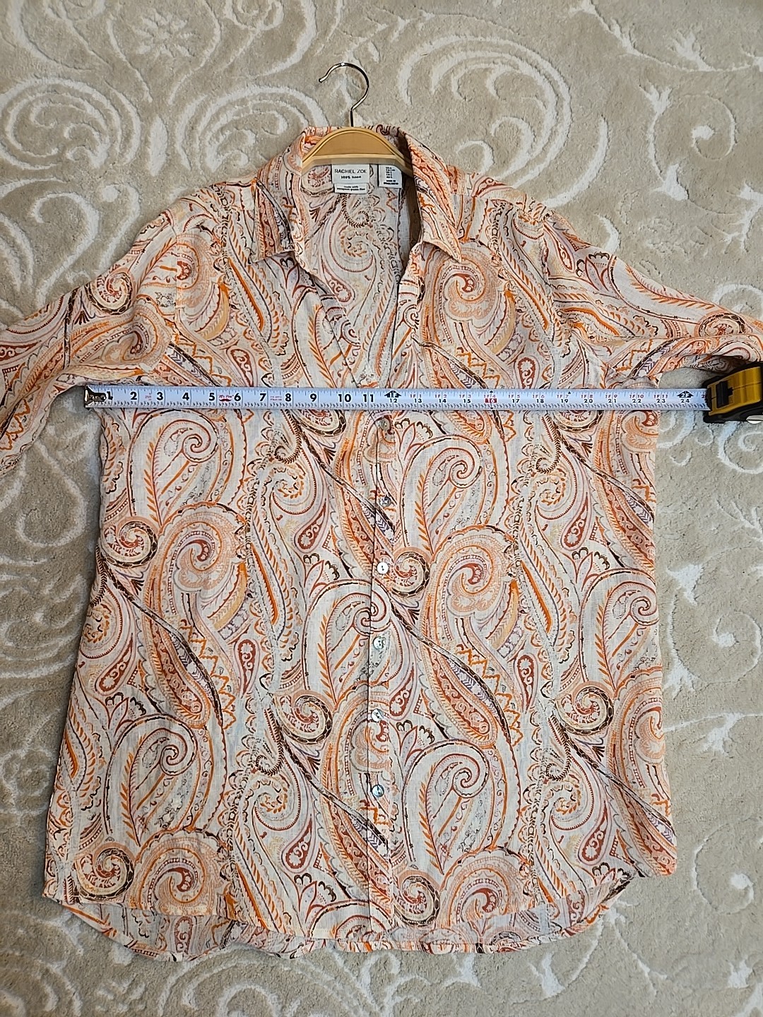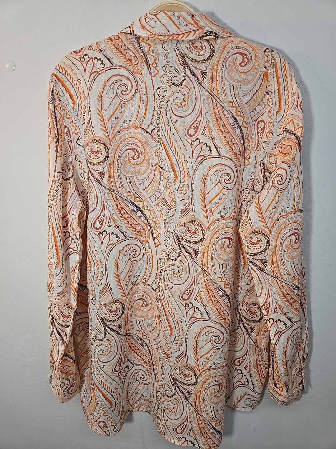 The Rachel Zoe 100% Linen Button Down Shirt Blouse in size L features a collared neckline, button closure, and roll tab sleeves. This paisley patterned blouse is perfect for various occasions such as travel, casual wear, and workwear. Made from lightweight and breathable linen fabric, it is suitable for all seasons. With a relaxed fit and colorful theme, this bohemian and classic style blouse from the renowned brand Rachel Zoe is a versatile addition to any woman's wardrobe. In excellent like new condition No visible flaws 100% Linen Machine Wash Cold Gorgeous blouse Please see photos for measurements and details :)