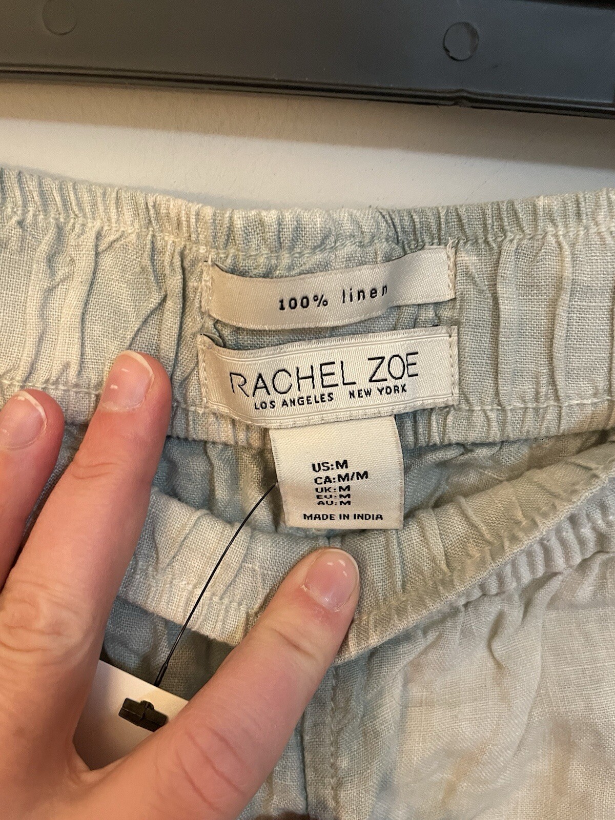 These are Rachel Zoe brand linen pants in a cream green tie-dye design, featuring a relaxed fit with a wide-leg and a cropped style. They have a pull-on closure and a flat front, with a high rise waist. The pants are size M and have a 25-inch inseam, perfect for a Lagonlook style.