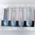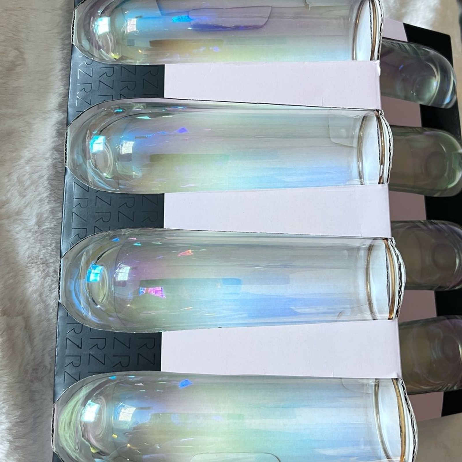 Brand new Rachel Zoe Champagne Flutes features iridescent colors with gold rims. Set of 4. New with box. I had them in my China cabinet but never used them. Box was opened when I bought them but glasses not taken out. Set of 4 Iridescent with gold rim Stemless champagne flutes 10 OZ Hand wash