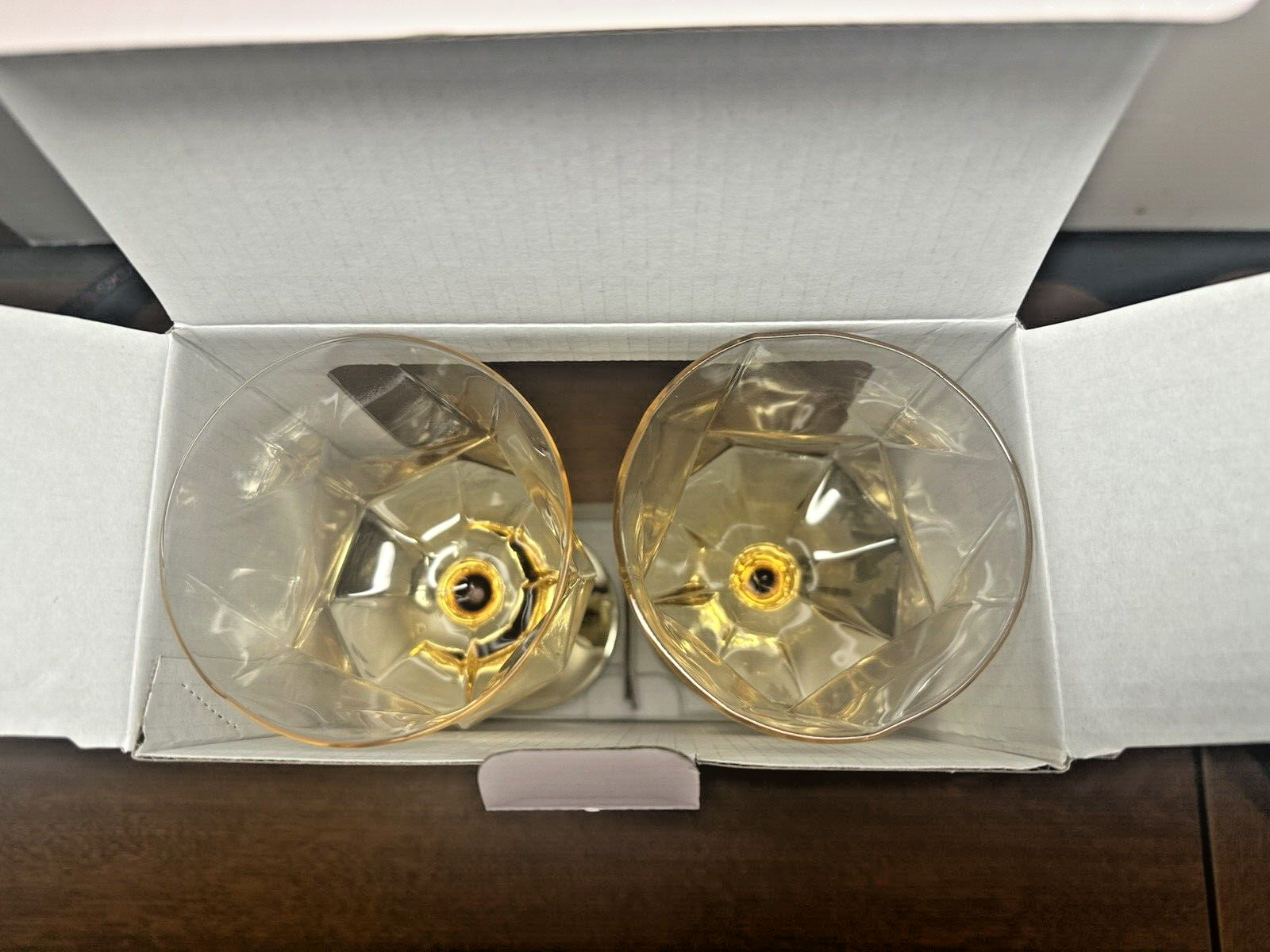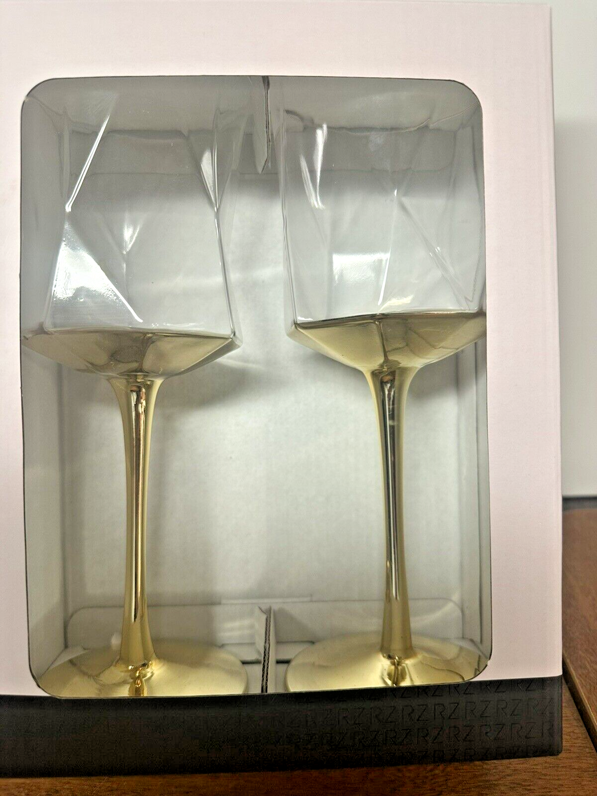 Set 2 ~ Rachel Zoe Wine Glasses Gold Stemmed Faceted Geometric Capacity: 13.25 oz ~ Approximately 8 1/4" H There are new in original box, I have not removed them from the box. The box is in excellent condition. Box color in pic looks almost white it is a pale pink. Thank you for looking. Check out my other items I have in my store. ~~Corner Side Variety~~ Items come from a smoke & pet free home Please view all of the pictures. I try to examine all pieces closely and note any issues. If you need more pictures or have any questions, please ask prior to purchasing, to ensure you are satisfied with your purchase. I strive for 100% customer satisfaction and value your positive feedback. If I charge for shipping, I will combine shipping with multiple purchases. Shipping and Handling includes a tracking number. NOTE: Depending on final packing & your zip code, I may use FedEx or UPS instead of USPS.