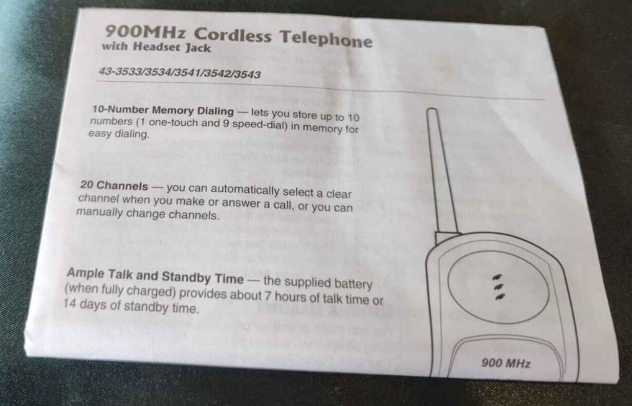 This cordless telephone from RadioShack is a great addition to your home or office. With a sleek black design, it is sure to blend in nicely with any decor. Radio Shack 10 Speed Dial 900MHz Cordless Telephone ET-3534 Black There are a few small buffs on phone and charger. It comes with the direction manual and original box. It does not have the phone cord that plugs into the wall.