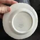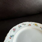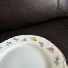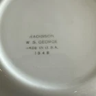 This vintage W S George Radisson bread dessert plate set includes 9 ceramic plates with a floral pattern and gold rim. The plates are round in shape, measuring 6 inches in diameter. They were manufactured in the 1960s in the United States and feature an Art Nouveau style. The brand is George, W. S., and the product line is Radisson. Good used condition, normal wear.