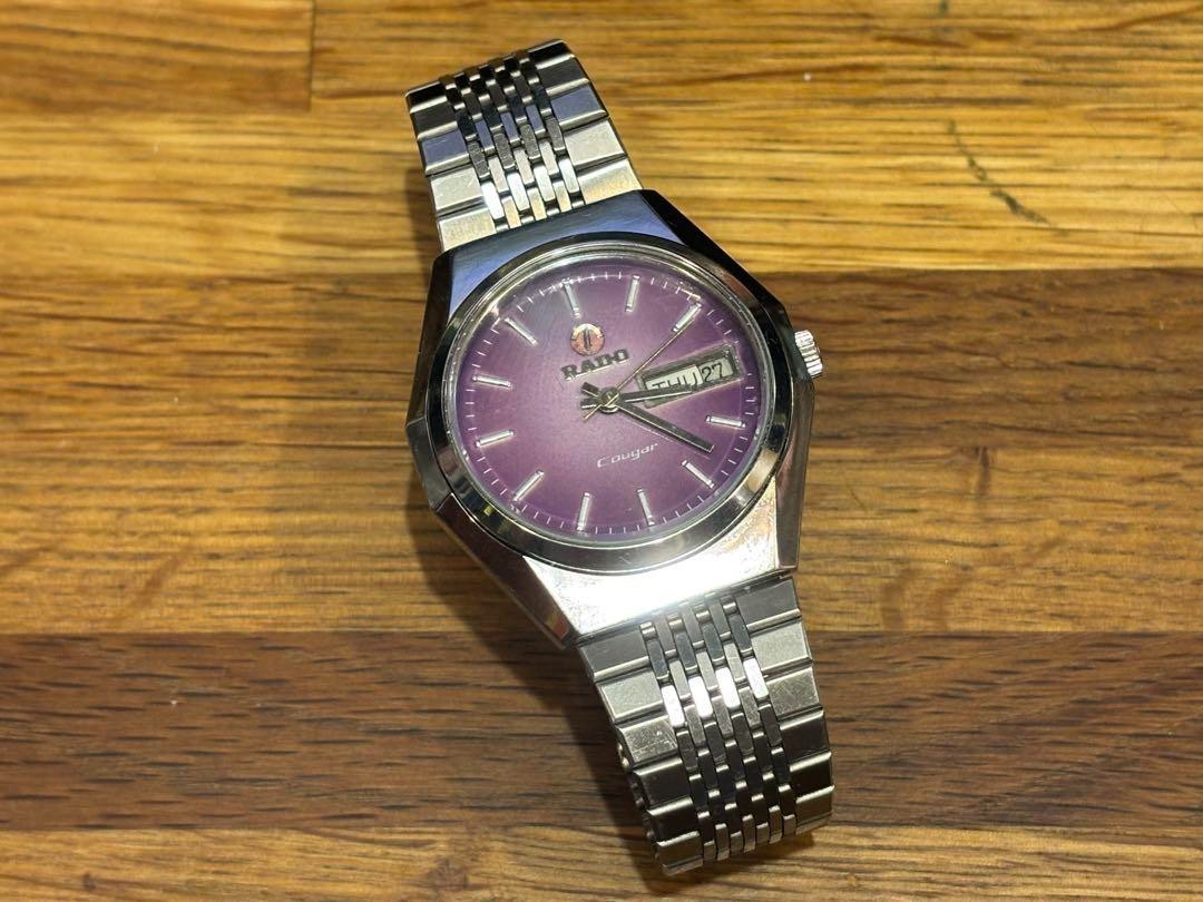Description RADO Cougar automatic watch with purple dial and stainless steel band. The daily rate is about 15 seconds. The oscillation angle is over 250 degrees and it is in good condition. The movement is ETA2836. - Brand: RADO - Model name: Cougar - Color: Purple - Waterproof function: Water Sealed - Date display: Yes - Band material: Stainless steel Dial color: Purple Belt color: Silver Accessories: No accessories Operation: Good Product condition: Some scratches and dirt Shipping Fedex,DHL,Japan Post *For FedEx / DHL shipping items, a person residing in the remote area will have to pay an additional shipping fee. International Buyers - Please Note: Import duties, taxes, and charges are not included in the item price or shipping cost. These charges are the buyer's responsibility. Please check with your country's customs office to determine what these additional costs will be prior to bidding or buying. Thank you for your understanding. Read more... Conditions shown here are based on our standard. Please understand that the conditions of used items that have been stored in our warehouse changes by time. Listings that shows "Working" means that it confirmed working when we stored items in our warehouse, some items might stop working during the shipment or after delivery to you.(We double check if they are working before shipping them out) Pre-owned(used) items are used items, so please purchase if you acknowledge it.
