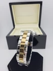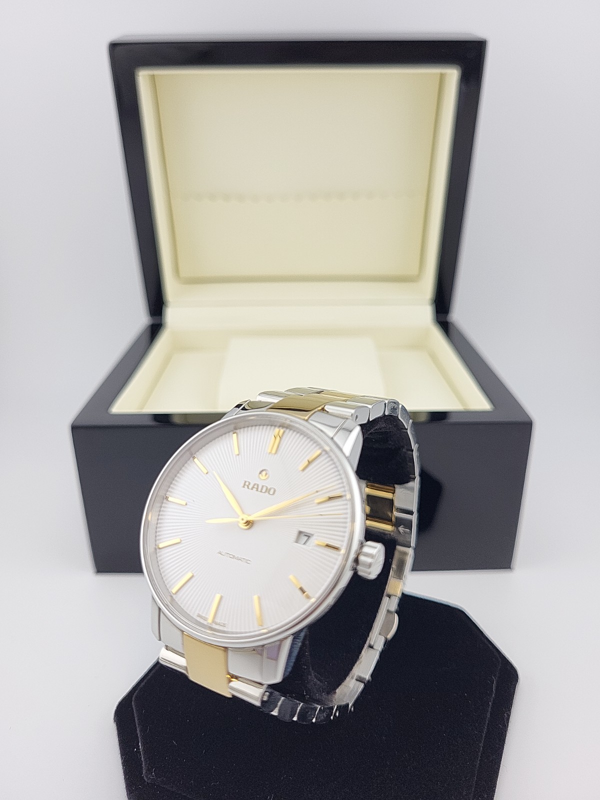 Rado Coupole Classic Men's Automatic Two-Tone Watch - R22860032 ($1600 MSRP) With Gift Box! This watch is a Shelf Pull from one of the Major Department Stores. Watch has scratches on the watch case/band. The Rado Coupole Classic Automatic Silver Dial Two-tone Men's Watch R22860032 is a testament to Swiss craftsmanship and sophisticated design. Encased in a 38mm stainless steel case and a matching bracelet with yellow ceramos center links, this timepiece exudes a blend of elegance and modern aesthetics. The fixed stainless steel bezel adds to its refined look. The silver dial showcases yellow gold-tone hands and index hour markers, with a date display at the 3 o'clock position. It is powered by the reliable Rado calibre 763 (ETA C07.611) automatic movement, boasting an impressive 80-hour power reserve. The scratch-resistant sapphire crystal protects the dial, ensuring lasting clarity. With a transparent case back, the watch reveals the intricate craftsmanship within. It is water-resistant up to 50 meters (165 feet), making it suitable for various occasions. The fold-over clasp secures the bracelet, offering both style and ease of use. Labeled "Swiss Made," it represents the highest standards of quality. The Rado Coupole Classic R22860032 is a dress watch that combines functionality with timeless elegance, making it an excellent choice for those who appreciate Swiss precision and sophisticated design. Features Stainless steel case with a stainless steel bracelet with yellow ceramos center links. Fixed stainless steel bezel. Silver dial with yellow gold-tone hands and index hour markers. Dial Type: Analog. Date display at the 3 o'clock position. Rado calibre 763 (ETA C07.611) automatic movement with an 80-hour power reserve. Scratch resistant sapphire crystal. Push / pull crown. Transparent case back. Round case shape. Case size: 38 mm. Case thickness: 10.2 mm. Band width: 20 mm. Fold over clasp. Water resistant at 50 meters / 165 feet. Functions: date, hour, minute, second. Dress watch style. Watch label: Swiss Made Fast and Free Shipping You're already purchasing the item. Why pay additional for shipping, especially slow shipping? We get your order shipped out within 1-business day and delivered to your doorstep as quickly as possible. Competitive Pricing With our dynamic pricing model, our prices are always competitive. Our prices are some of the lowest that you will find on the internet. Rest assured that you're getting a good deal when purchasing with us. 30-day Money Back Guarantee We are committed to making sure that you leave this transaction satisfied. If you're unhappy with the product for any reason, you may return it back for your money-back or a replacement within 30 days. No questions asked!
