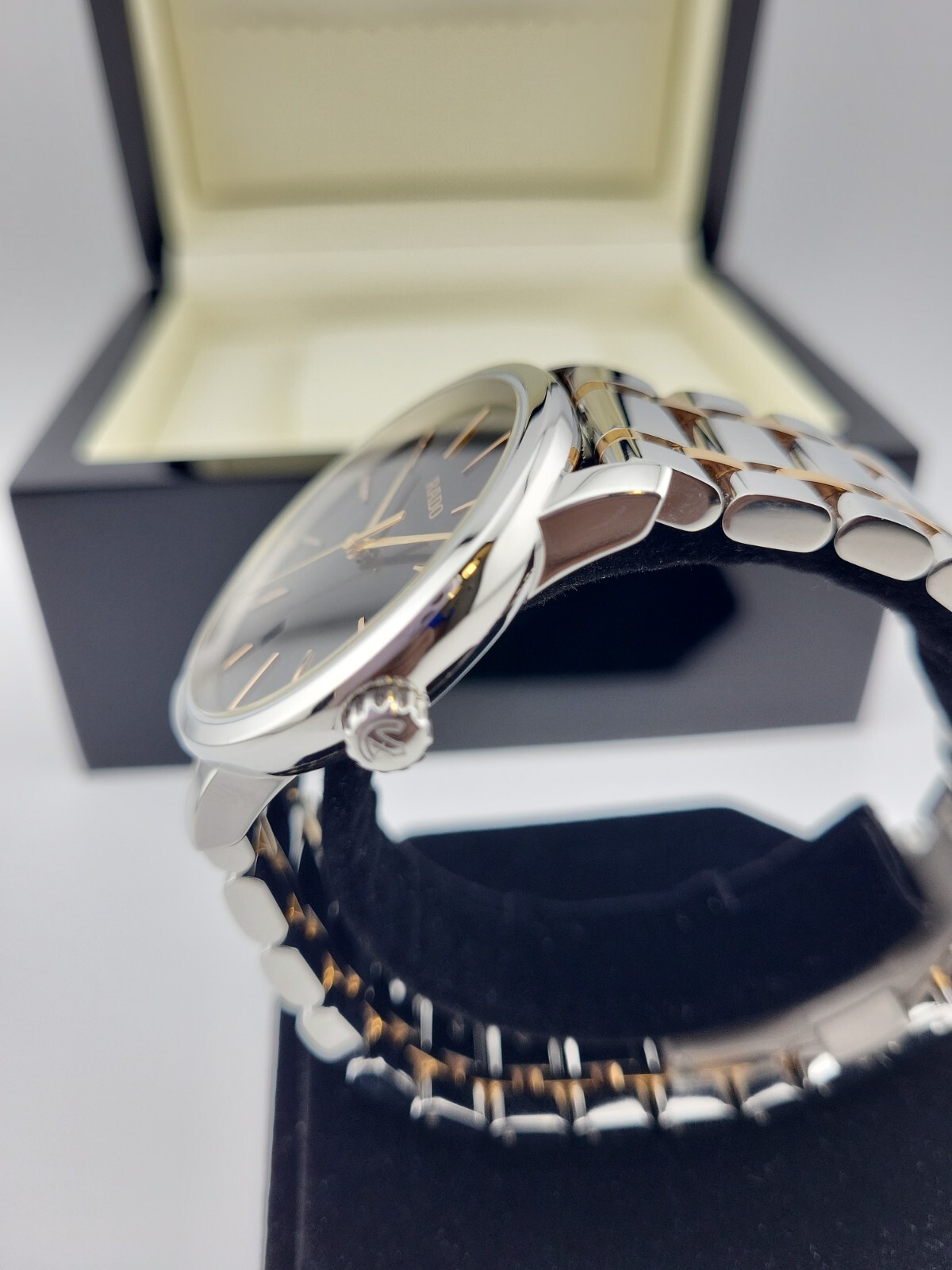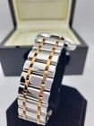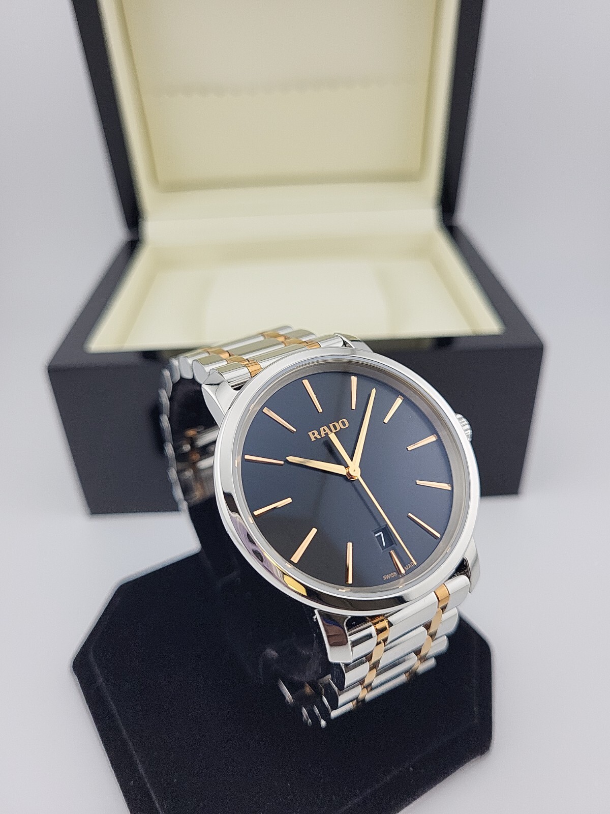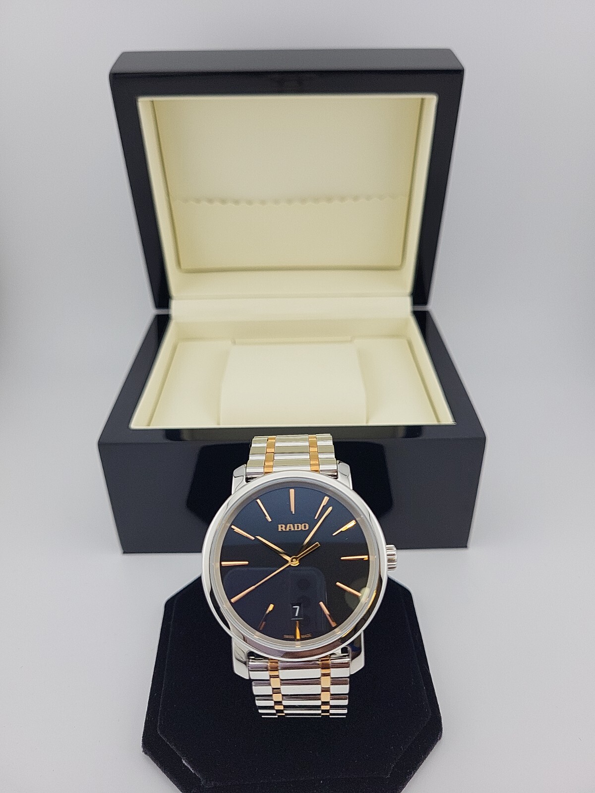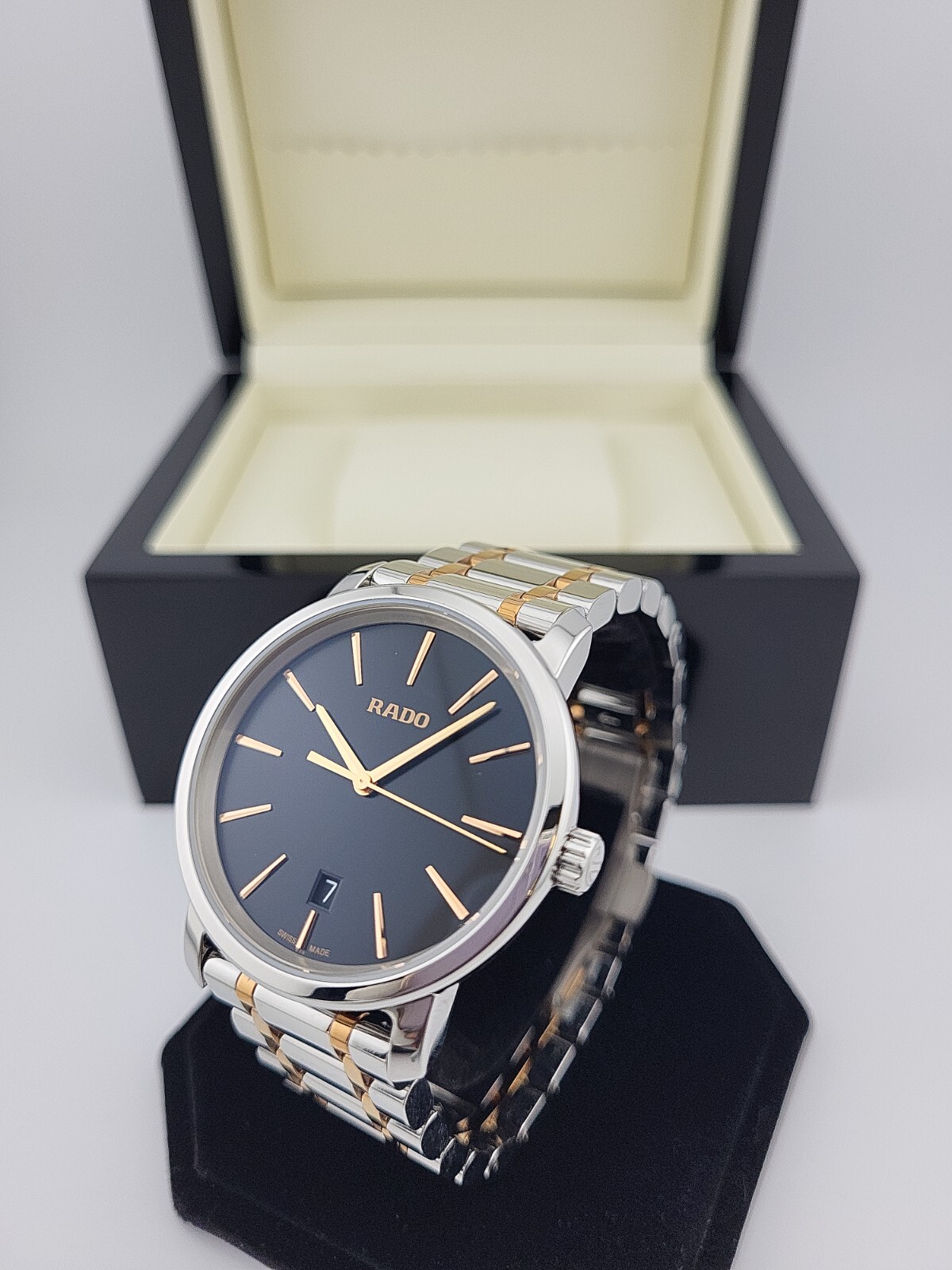 Rado Men’s DiaMaster Black Dial Two-Tone Watch - R14078163 ($1700 MSRP) With Gift Box! This watch is a Shelf Pull from one of the Major Department Stores. Watch has micro scratches on the watch case/band, visible under direct light. The Rado Men’s DiaMaster Black Dial Two-Tone Watch – R14078163 exemplifies sophisticated style and precise engineering. This exquisite timepiece features a robust stainless steel case paired with an elegant two-tone bracelet that combines silver-tone stainless steel and rose gold PVD accents, creating a striking visual appeal. The fixed stainless steel bezel enhances the watch's sleek design, while the black dial provides a bold backdrop for the rose gold-tone hands and index hour markers, ensuring both style and legibility. Designed for accuracy and reliability, this analog watch is powered by a quartz movement. The date display is conveniently located at the 6 o'clock position, adding a functional element to its aesthetic design. The watch is protected by a scratch-resistant sapphire crystal, ensuring durability against daily wear. The pull/push crown and solid case back further contribute to its sturdy construction. With a generous case size of 46 mm in diameter and a thickness of 9 mm, this watch makes a bold statement on the wrist. The bracelet, with a width of 21 mm and a length of 8 inches, is secured with a fold-over clasp with a push button release, offering both comfort and security. Water-resistant up to 100 meters (330 feet), this watch is suitable for various water activities while maintaining its refined look. The Rado Men’s DiaMaster Black Dial Two-Tone Watch is the perfect blend of elegance and functionality, making it an excellent choice for those who value both style and performance in their timepieces. Features Stainless steel case with a two-tone (silver-tone and rose gold PVD) stainless steel bracelet. Fixed stainless steel bezel. Black dial with rose gold-tone hands and index hour markers. Dial Type: Analog. Date display at the 6 o'clock position. Quartz movement. Scratch resistant sapphire crystal. Pull / push crown. Solid case back. Round case shape. Case size: 46 mm. Case thickness: 9 mm. Band width: 21 mm. Band length: 8 inches. Fold over clasp with a push button release. Water resistant at 100 meters / 330 feet. Functions: date, hour, minute, second Fast and Free Shipping You're already purchasing the item. Why pay additional for shipping, especially slow shipping? We get your order shipped out within 1-business day and delivered to your doorstep as quickly as possible. Competitive Pricing With our dynamic pricing model, our prices are always competitive. Our prices are some of the lowest that you will find on the internet. Rest assured that you're getting a good deal when purchasing with us. 30-day Money Back Guarantee We are committed to making sure that you leave this transaction satisfied. If you're unhappy with the product for any reason, you may return it back for your money-back or a replacement within 30 days. No questions asked!