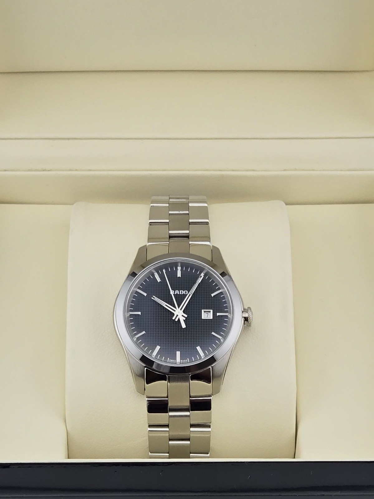 Rado Hyperchrome Women’s Black Dial Swiss Watch – R32110163 ( $1550 MSRP ) With Gift Box! This watch is a Shelf Pull from one of the Major Department Stores. Watch has micro scratches on the watch case/band, visible under direct light. The Rado Women’s Hyperchrome Black Dial Quartz Watch – R32110163 is a testament to Rado's commitment to combining elegance with functionality. Encased in stainless steel, this watch features a matching stainless steel bracelet that adds a touch of sophistication to any outfit. The fixed stainless steel bezel frames a sleek black dial, which is adorned with luminous silver-tone hands and index hour markers, ensuring readability in various lighting conditions. The analog dial is both stylish and practical, featuring luminescent hands and markers that enhance visibility. Minute markers encircle the outer rim of the dial, providing additional time-tracking precision. A convenient date display is positioned at the 3 o'clock mark, adding to the watch's functionality. The timepiece is powered by a reliable quartz movement, ensuring accurate timekeeping. The scratch-resistant sapphire crystal protects the dial, preserving its clarity and preventing damage. Designed for everyday wear, the Rado Women’s Hyperchrome watch has a round case with a diameter of 33 mm and a thickness of 10 mm, making it a comfortable fit on the wrist. The bracelet, measuring 15 mm in width, is secured with a deployment clasp for added safety and convenience. The watch is water-resistant up to 50 meters (165 feet), making it suitable for light water activities. Its functions include displaying the date, hour, minute, and second, making it a versatile and practical accessory for any occasion. Features Stainless steel case with a stainless steel bracelet. Fixed stainless steel bezel. Black dial with luminous silver-tone hands and index hour markers. Minute markers around the outer rim. Dial Type: Analog. Luminescent hands and markers. Date display at the 3 o'clock position. Quartz movement. Scratch resistant sapphire crystal. Solid case back. Round case shape. Case size: 33 mm. Case thickness: 10 mm. Bracelet width: 15 mm. Deployment clasp. Water resistant at 50 meters / 165 feet. Functions: date, hour, minute, second Fast and Free Shipping You're already purchasing the item. Why pay additional for shipping, especially slow shipping? We get your order shipped out within 1-business day and delivered to your doorstep as quickly as possible. Competitive Pricing With our dynamic pricing model, our prices are always competitive. Our prices are some of the lowest that you will find on the internet. Rest assured that you're getting a good deal when purchasing with us. 30-day Money Back Guarantee We are committed to making sure that you leave this transaction satisfied. If you're unhappy with the product for any reason, you may return it back for your money-back or a replacement within 30 days. No questions asked!