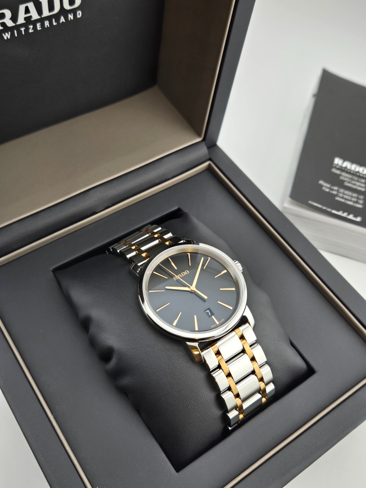 Rado Men’s DiaMaster Black Dial Two-Tone Watch - R14078163 ($1700 MSRP) With Original Box! This watch is a Shelf Pull from one of the Major Department Stores. Watch has micro scratches on the watch case/band, visible under direct light. The Rado Men’s DiaMaster Black Dial Two-Tone Watch – R14078163 exemplifies sophisticated style and precise engineering. This exquisite timepiece features a robust stainless steel case paired with an elegant two-tone bracelet that combines silver-tone stainless steel and rose gold PVD accents, creating a striking visual appeal. The fixed stainless steel bezel enhances the watch's sleek design, while the black dial provides a bold backdrop for the rose gold-tone hands and index hour markers, ensuring both style and legibility. Designed for accuracy and reliability, this analog watch is powered by a quartz movement. The date display is conveniently located at the 6 o'clock position, adding a functional element to its aesthetic design. The watch is protected by a scratch-resistant sapphire crystal, ensuring durability against daily wear. The pull/push crown and solid case back further contribute to its sturdy construction. With a generous case size of 46 mm in diameter and a thickness of 9 mm, this watch makes a bold statement on the wrist. The bracelet, with a width of 21 mm and a length of 8 inches, is secured with a fold-over clasp with a push button release, offering both comfort and security. Water-resistant up to 100 meters (330 feet), this watch is suitable for various water activities while maintaining its refined look. The Rado Men’s DiaMaster Black Dial Two-Tone Watch is the perfect blend of elegance and functionality, making it an excellent choice for those who value both style and performance in their timepieces. Features Stainless steel case with a two-tone (silver-tone and rose gold PVD) stainless steel bracelet. Fixed stainless steel bezel. Black dial with rose gold-tone hands and index hour markers. Dial Type: Analog. Date display at the 6 o'clock position. Quartz movement. Scratch resistant sapphire crystal. Pull / push crown. Solid case back. Round case shape. Case size: 46 mm. Case thickness: 9 mm. Band width: 21 mm. Band length: 8 inches. Fold over clasp with a push button release. Water resistant at 100 meters / 330 feet. Functions: date, hour, minute, second Fast and Free Shipping You're already purchasing the item. Why pay additional for shipping, especially slow shipping? We get your order shipped out within 1-business day and delivered to your doorstep as quickly as possible. Competitive Pricing With our dynamic pricing model, our prices are always competitive. Our prices are some of the lowest that you will find on the internet. Rest assured that you're getting a good deal when purchasing with us. 30-day Money Back Guarantee We are committed to making sure that you leave this transaction satisfied. If you're unhappy with the product for any reason, you may return it back for your money-back or a replacement within 30 days. No questions asked!