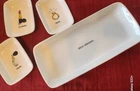▪︎BRAND: Rae Dunn ▪︎DESCRIPTION: 4 piece collectable vanity, makeup tray set. ▪︎CONDITION: Excellent ▪︎SIZE: Large tray is 12"×6" ☆Reasonable Offers Welcome☆ ☆☆ SAVE: Bundle two or more items and get 20% off. Plus, you only pay one shipping fee. Let me know what you would like bundled, and I'll send you the offer☆☆ ♡SMOKE FREE HOME♡ ♡Thanks for looking♡