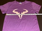 This shirt is brand new never worn but it has been washed. Comes from a smoke and pet free home. This Rafael Nadal women's t-shirt is perfect for any active woman looking for a comfortable and breathable piece of clothing. With a crew neck and short sleeves, this pullover t-shirt comes in a beautiful shade of purple and is made from dark wash fabric that is easy to care for. It is suitable for all seasons and occasions, whether you're going to the gym, playing tennis, walking, or just running errands. The shirt is designed with an athletic fit and is available in size small. It is collarless and has no vintage elements. The t-shirt is perfect for cross-training, CrossFit, and school activities.