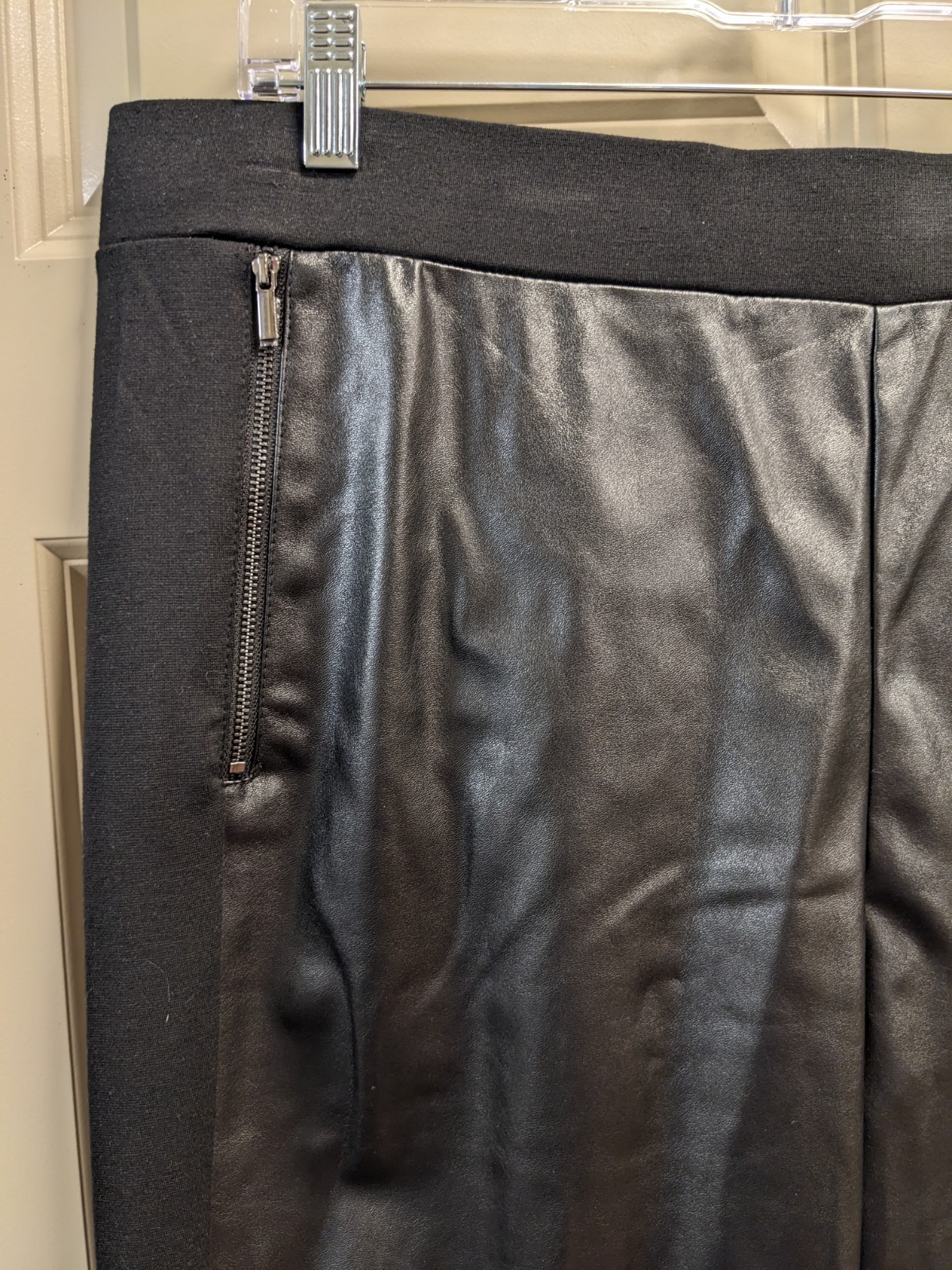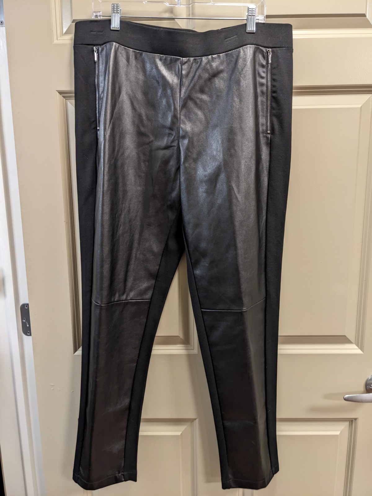 new with tags: stylish black faux leather and ponte knit women's pants. perfect for any occasion. The sleek design offers a modern look can dress it down as well. front - 100% polyester, back, 79% polyester, 17% rayon, 4% spandex. pull on comfortable waistband stretch ankle length two side zipper front pockets measurements: waist laid flat 19 in length 41 and 1/2 in inseam 30 in retail $72