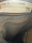Elevate your style with these Rag and Bone Skinny Blue Jeans in size 26. Crafted from a cotton blend and denim fabric, these jeans are perfect for any occasion. They feature a solid pattern, zip closure, and a mid-rise waist of 26 inches. The dark wash and slim fit of these jeans will make you stand out from the crowd. With accents such as a zipper and logo, these jeans are a must-have for any fashion-forward woman. The stretch and pocket features make them comfortable and practical. These jeans are perfect for any wardrobe, and you can pair them with any top for a chic look. Preowned Good Condition