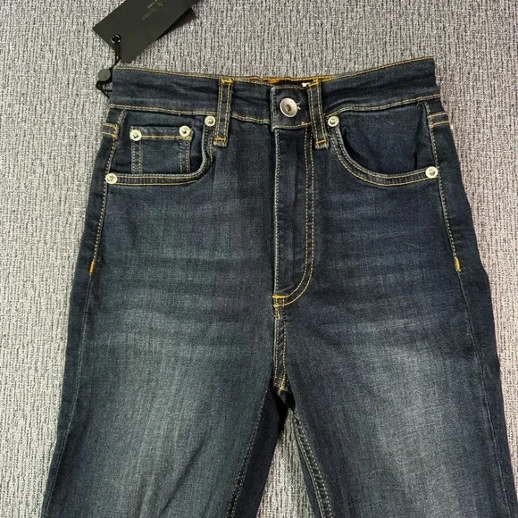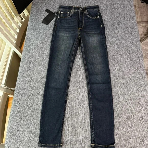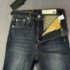New with tag WT. Rag & Bones Skinny Jeans in a size 24. High rise style. Sits below waist. Slim through hip and thigh. Skinny leg. Zipper and button fly. Please see photos for details and measurements.