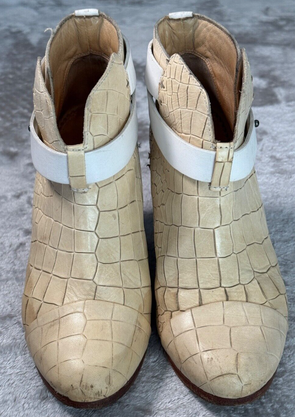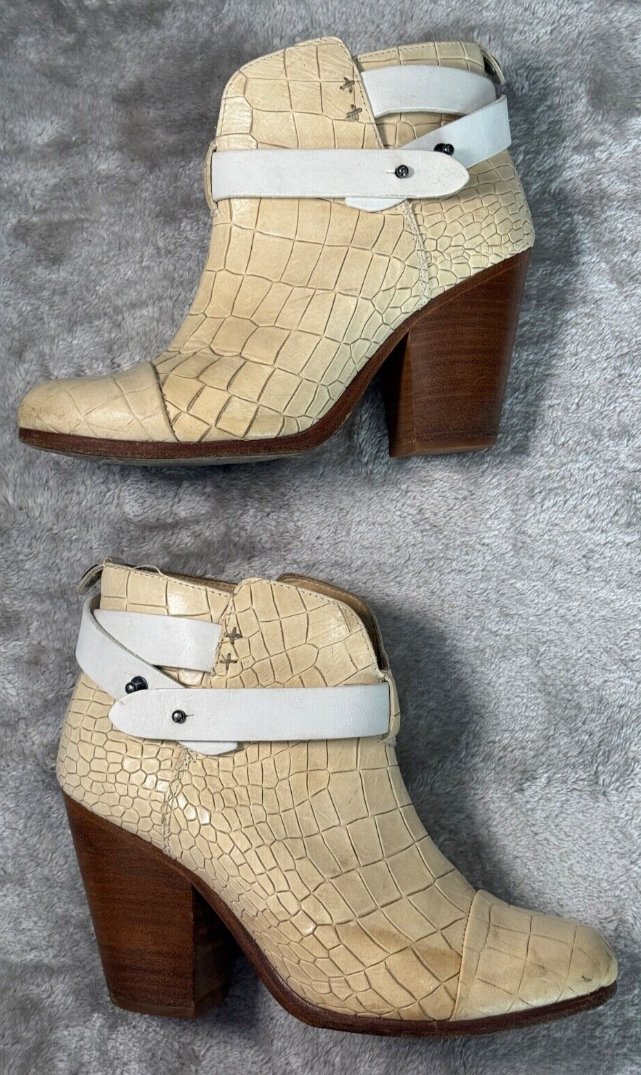 Rag & Bone Harrow Ivory White Croc Embossed Leather Cap Toe Boots Womens 7 EU 37 Good condition - see pictures for wear. Water stains across sides of both shoes as shown. All orders ship within one business day. Feel free to ask any questions before buying, we want you to be happy with your purchase. Smoke-free environment