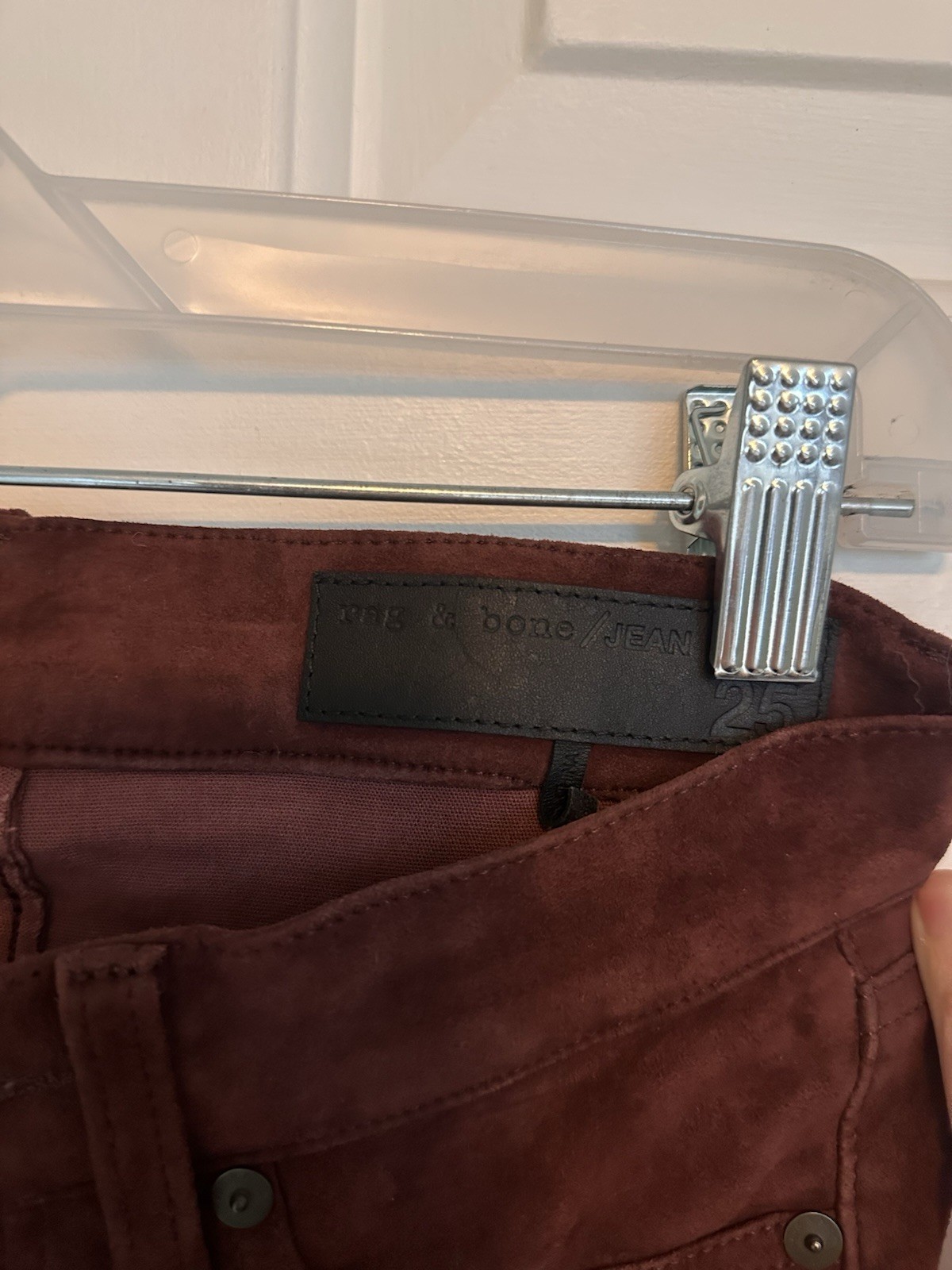 These Rag & Bone Lamb Suede Burgundy Skinny Pants in women's size 25 are a stylish and versatile addition to any wardrobe. Made from high-quality leather with a solid red color and a mid-rise fit, these pants are perfect for both casual and party occasions. The flat front and skinny leg style offer a sleek and modern look, while the brand logo accents add a touch of sophistication. Designed in the United States, these pants are durable and fashionable, making them a statement piece for any outfit.