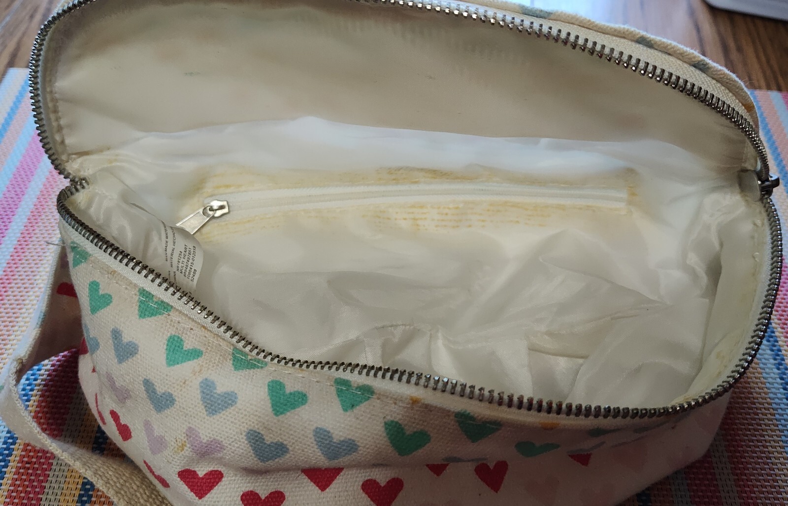 This waist bag is perfect for any occasion. With a colorful rainbow exterior and heart pattern, it's sure to be a conversation starter. It is pre-owned with a yellow stain by inside zippered pocket. (See photo)