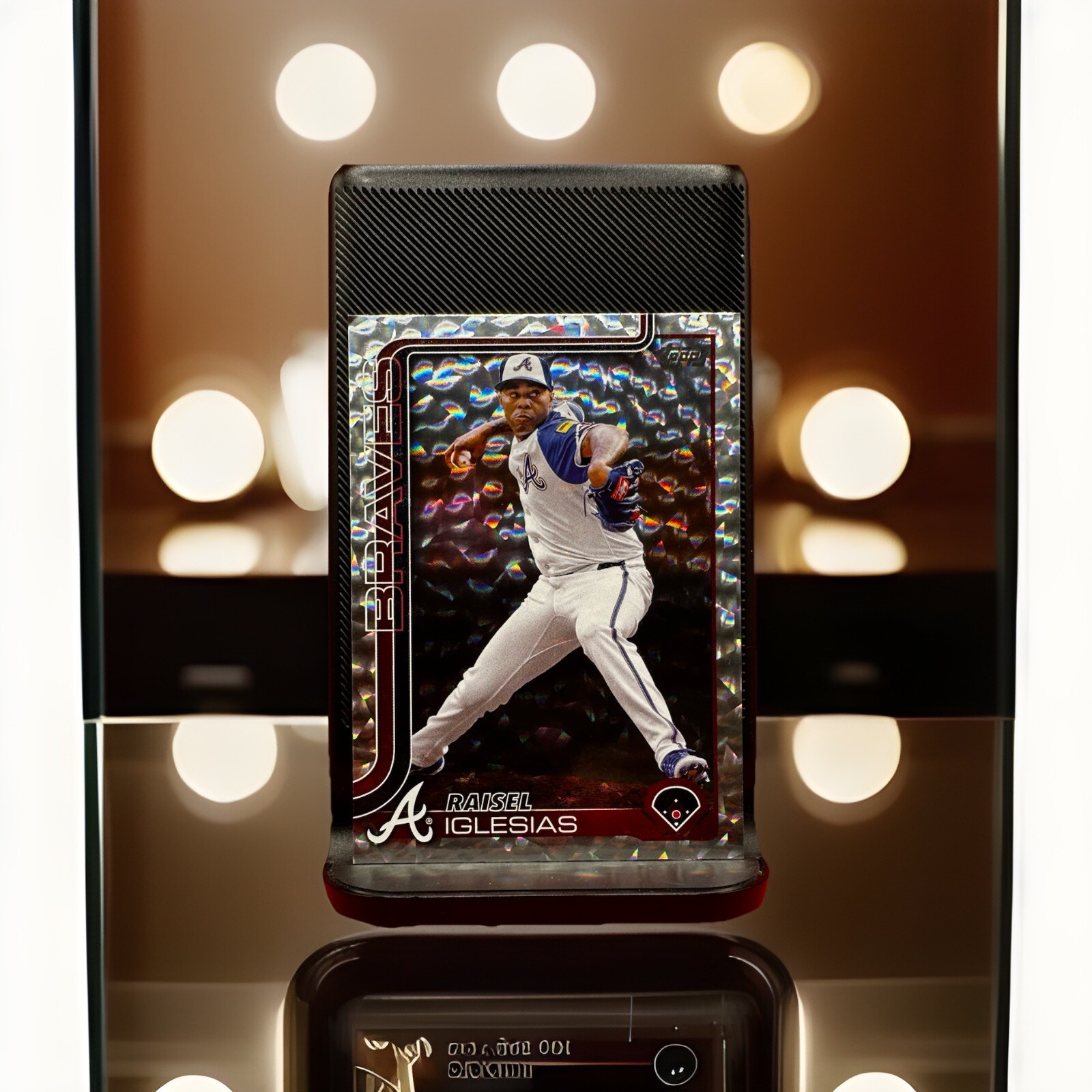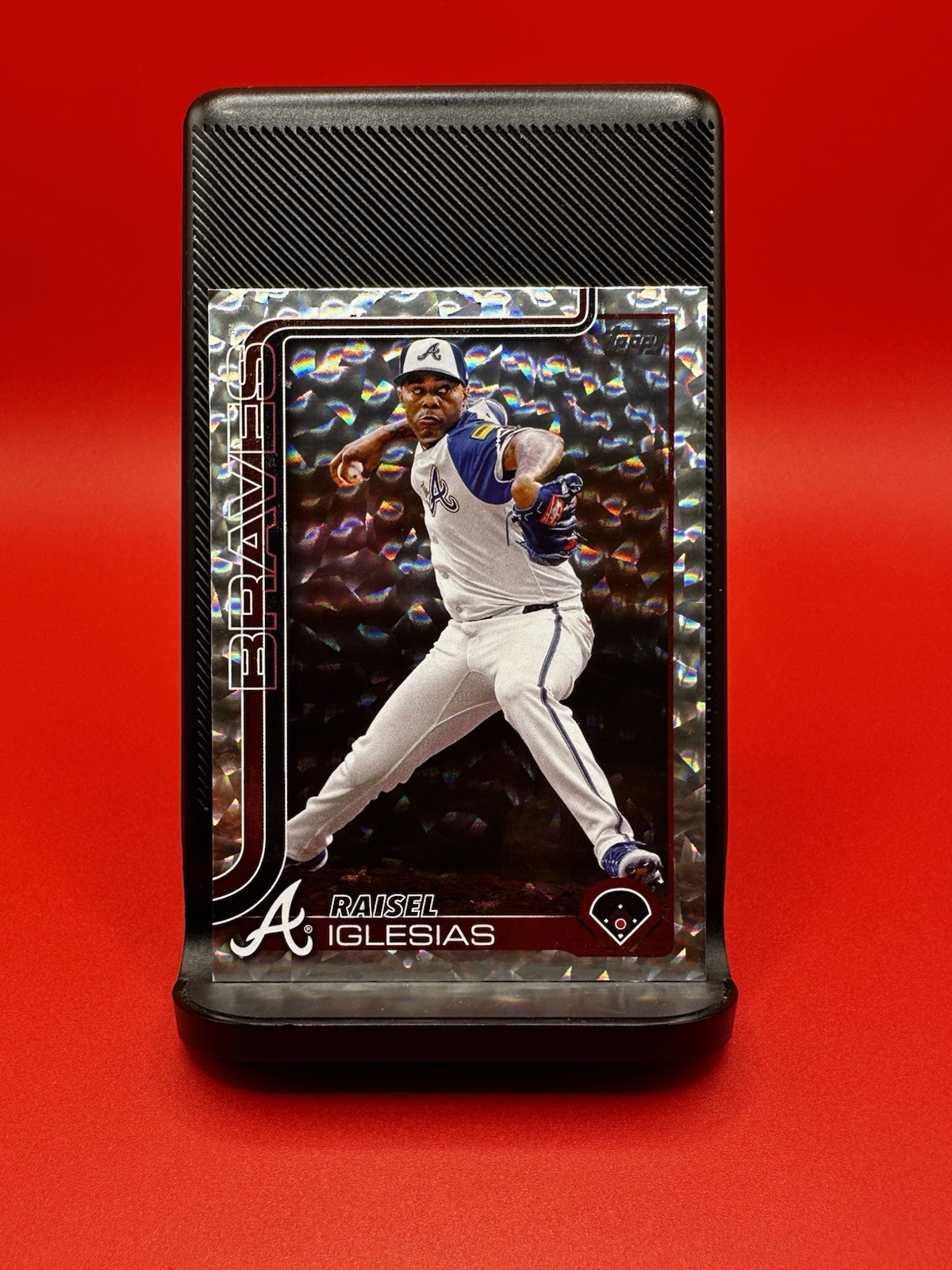 Card Details Player: Raisel Iglesias Team: Atlanta Braves Season: 2025 (Flagship Series 1) Card Set: 2025 Topps Series 1 Card Number: #304 Insert Type: Silver Diamante Foil Parallel Season Statistics (2025 MLB – as of June 13, 2025) Games Pitched: 27 Record: 3‑5 Saves: 8 (T‑24th in MLB) ERA: 6.23 Innings Pitched: 26.0 Strikeouts: 28 WHIP: 1.46 Season Highlights Serves as the Atlanta Braves’ primary closer, compiling 8 saves through mid-June. Recorded 28 strikeouts in just 26 innings, demonstrating strong strikeout ability. Career reliever with 232 saves and a durable tenure across Cincinnati, LA Angels, and Atlanta since 2015. Player Background Raisel Iglesias is a veteran right-handed closer who debuted with the Reds in 2015 before moving on to the Angels and now the Braves. Known for his high-velocity fastball-slider combination, he has amassed 232 career saves and a 2.99 ERA over 694 innings pitched. A 2021 All-MLB Second Team selection, Iglesias brings proven save-closing pedigree to Atlanta.