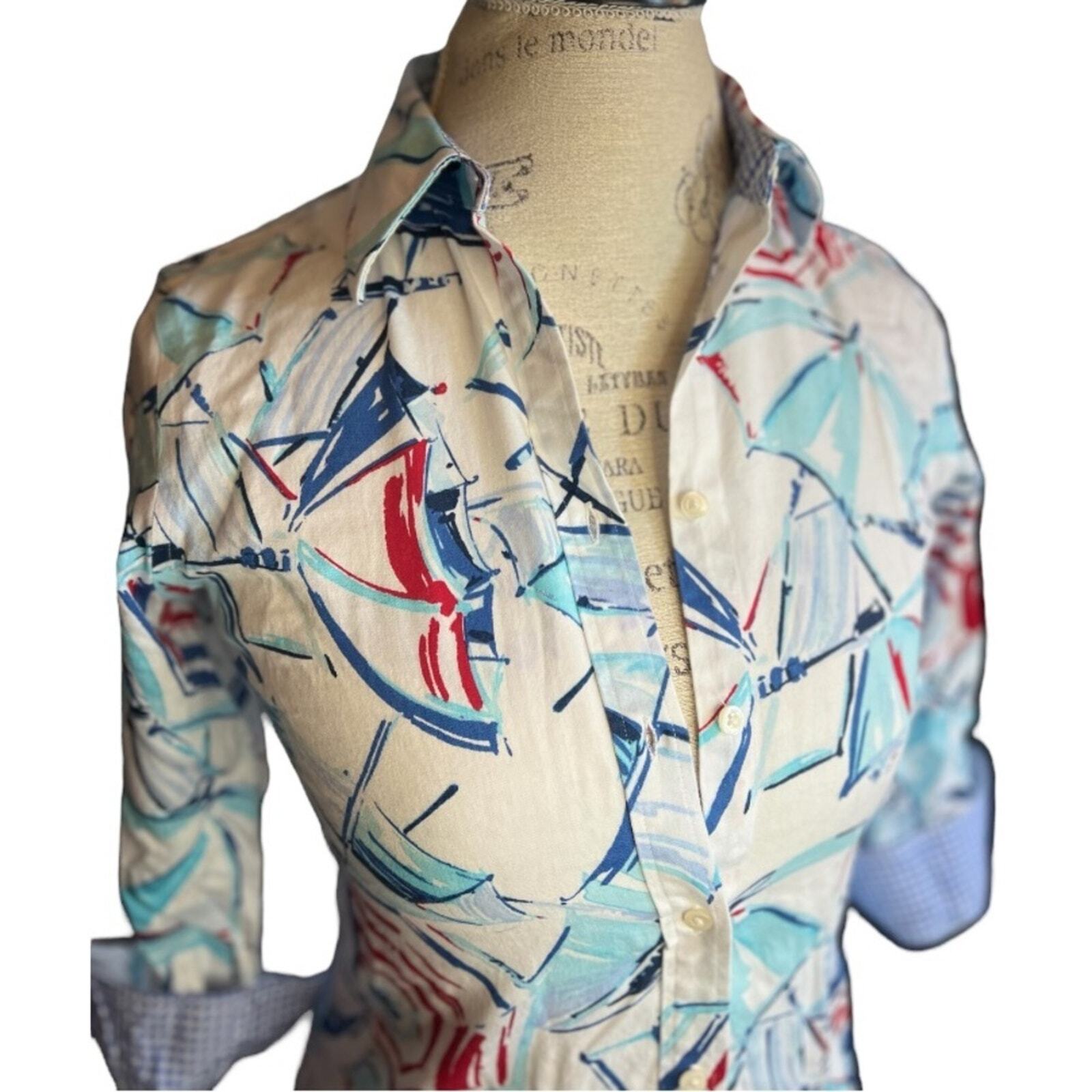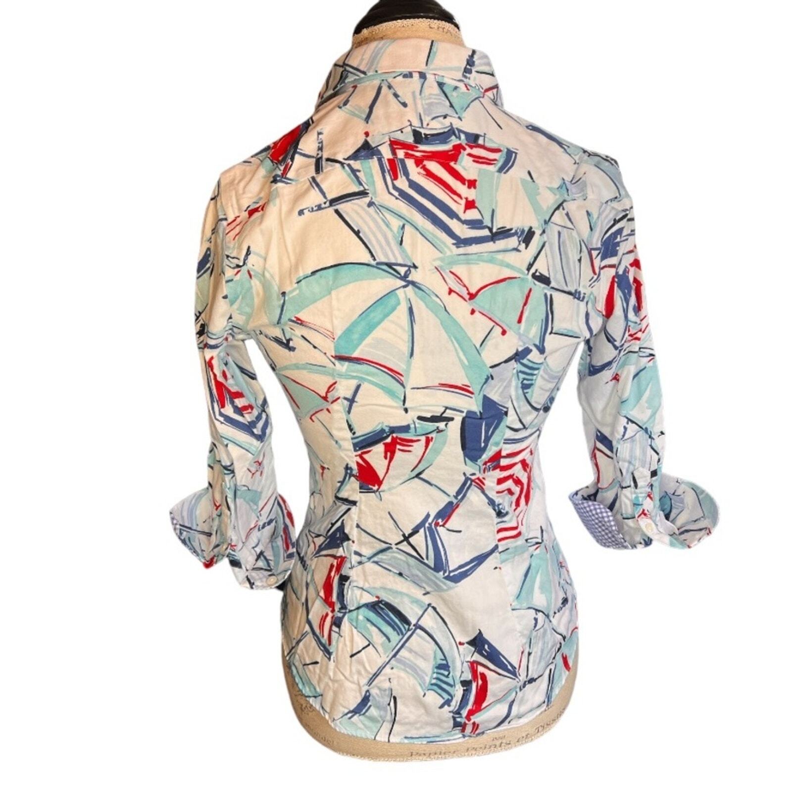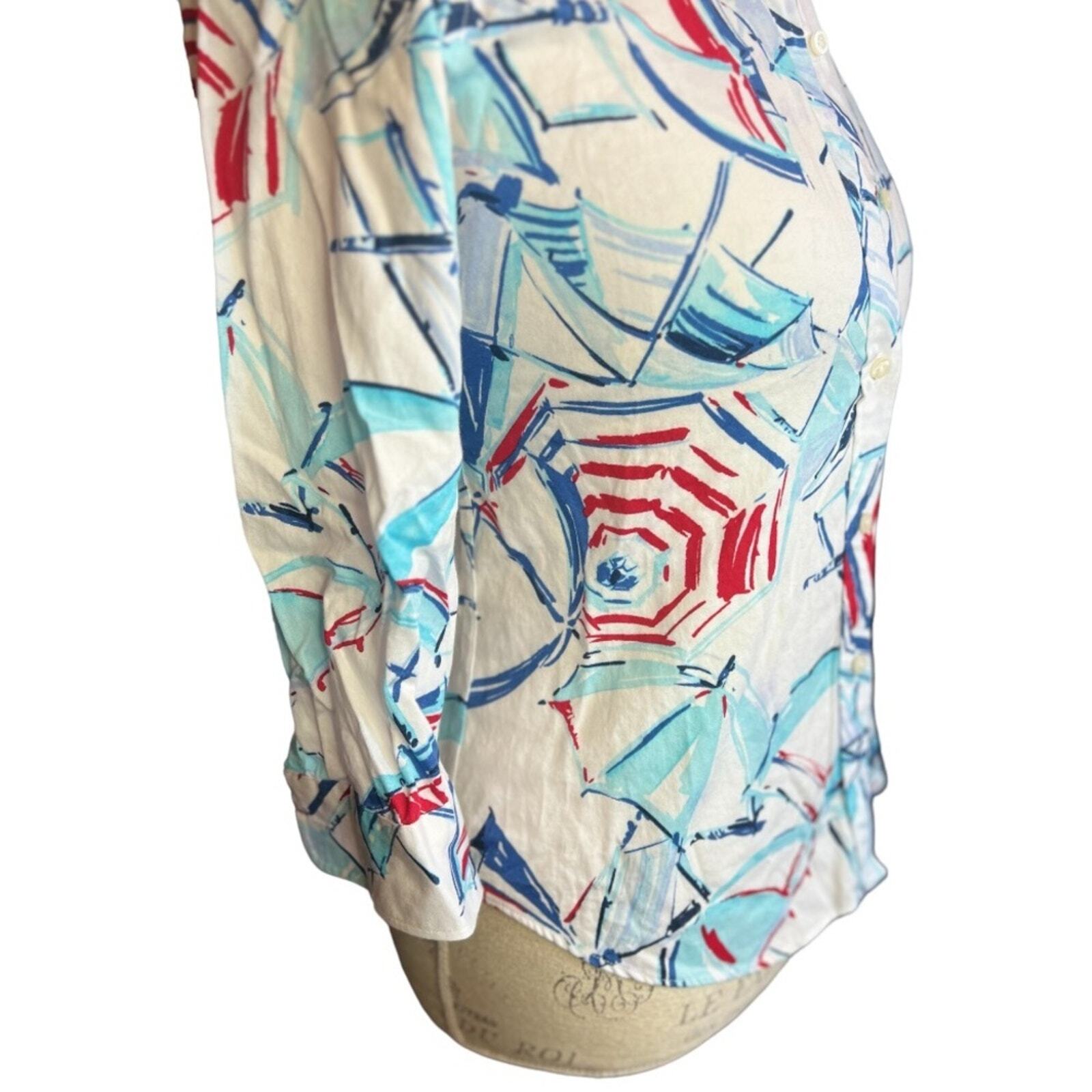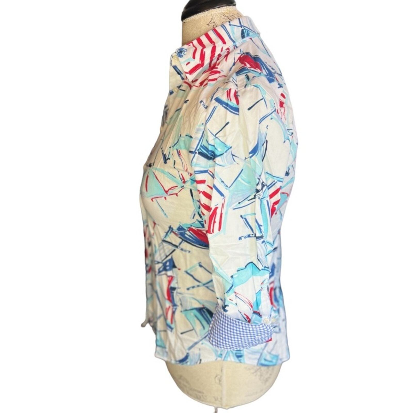 Ralph Lauren Chaps Blouse Beach Chairs/ Beach Umbrellas/Nautical Print White with red, turquoise, blue & navy allover print Women’s size small Excellent condition, no call outs! Perfect for 4th of July! Beach Chairs/ Beach Umbrellas/Nautical Print “No Iron” Button front and button cuffs 3/4 sleeves w contrasting gingham checked fabric inside cuffs & collar Scooped hem Machine washable 100% cotton Questions? Leave a comment below!