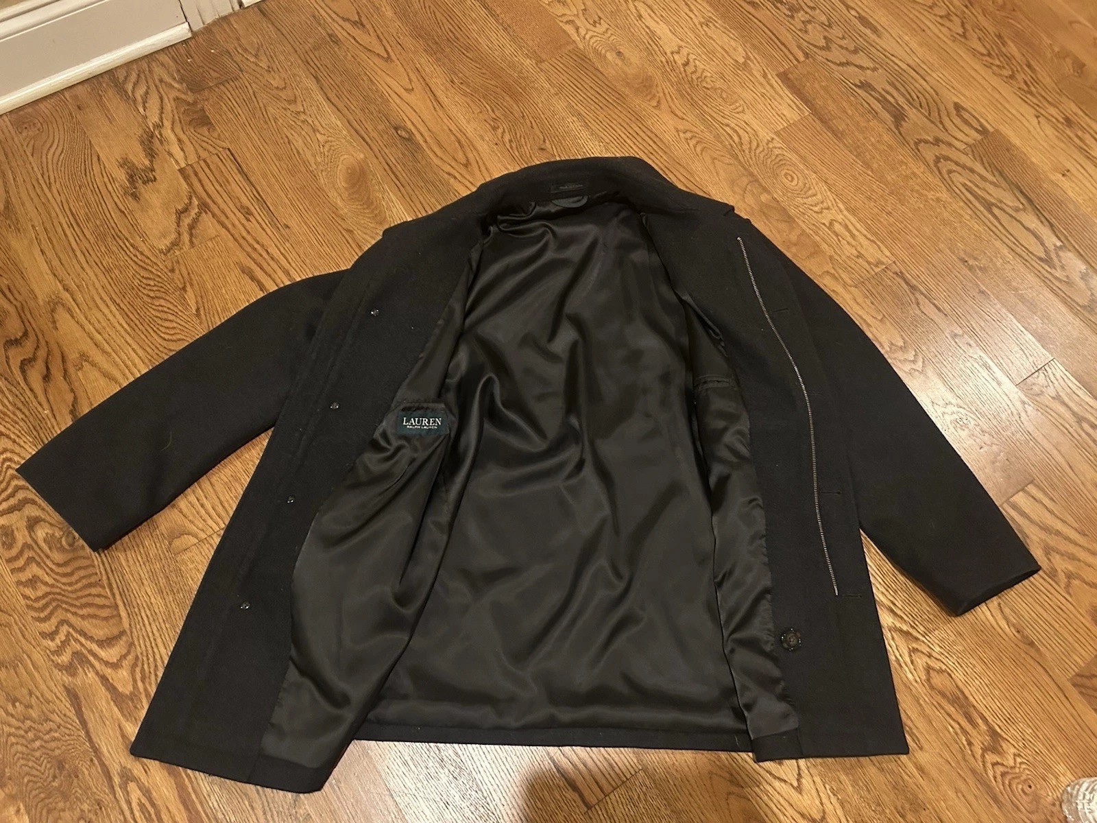 The product is a Lauren Ralph Lauren peacoat in medium size, made of wool with a polyester lining. It features a classic spread collar, full zipper closure, and multiple pockets for functionality. The jacket, with a mid-length and in a solid black color, is suitable for various occasions such as travel, casual, formal, workwear, and business. This peacoat from a reputable brand offers a timeless and versatile outerwear option for men during the winter, fall, and spring seasons. Excellent condition. No holes or stains. Smoke free home. Pit to pit measures 36 inches Shoulder to shoulder measures about 38 inches Shoulder to bottom hem length about 33 inches