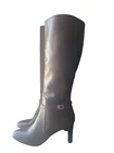 The Ralph Lauren Elberta Leather Brown Riding Boot in size 7 is a stylish knee-high boot featuring an almond toe shape and a mid heel height. Made of leather with a zipper closure, this boot is designed for the winter and fall seasons. It has silver buckles, an ankle strap, and cushioned insoles for comfort, making it perfect for everyday wear. The boot also features an accent zipper detail and a kitten heel style, adding a touch of sophistication to the classic riding boot design.