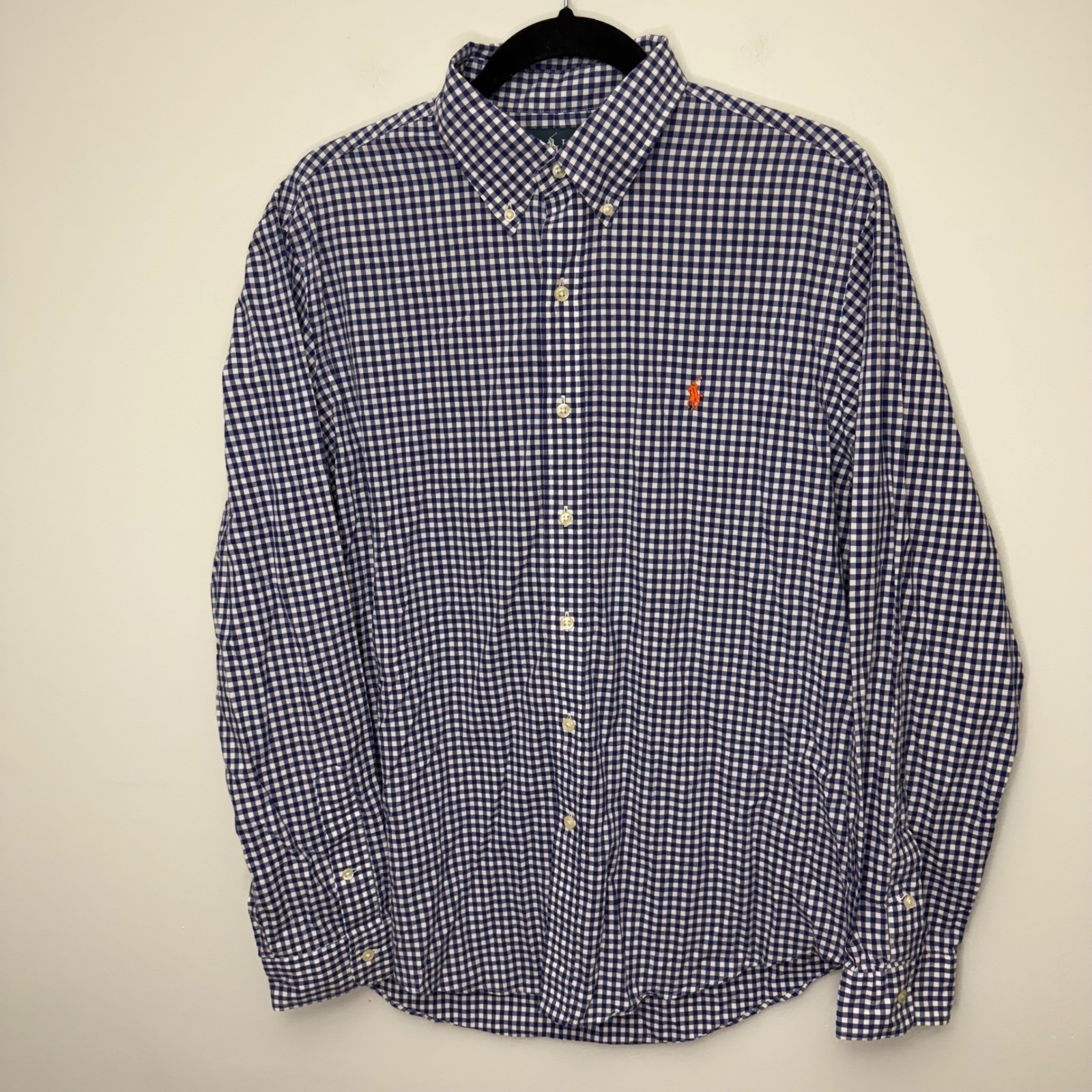 Ralph Lauren men's long sleeve button down shirt in a classic navy and white gingham pattern. Features the iconic orange embroidered pony logo on the left chest and a button-down collar. Measurements Armpit to Armpit: 23.5 inches Top of Collar to Bottom: 31.5 inches Shoulder Seem to Shoulder Seem: 18.5 inches Please use these measurements on something you own to compare before purchasing Keywords: polo, button up, gingham check, classic, preppy, casual, tailored fit, sport shirt, embroidered, collared