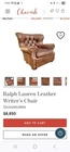 Ralph Lauren Writer's Chair bought in 1996. 1990s Ralph LaurEMblematic of Ralph Lauren Tufted Leather Writer's Wing Chair. Emblematic of Ralph Lauren's iconic and enduring style, this … Read more Dimensions41ʺW × 41ʺD × 36ʺH StylesContemporaryEnglishModern Seat Interior Depth25.0 in Seat Interior Width22.0 in Seat Height17.0 in Number of Seats1 Arm Height23.0 in BrandRalph Lauren Country of OriginUnited States Item TypeVintage, Antique or Pre-owned Shop Sustainably with Chairish MaterialsLeatherWood ConditionGood Condition, Original Condition Unaltered except for wood buns legs it sits on. I replaced these with custom legs. you can put the buns back but they slipped and would commonly break so we replaced so the chair would not slide around, Some Imperfections ColorBrown Condition NotesThis vintage item remains fully functional, but it shows signs of age through scuffs, dings, faded finishes, minimal upholstery defects Truly amazing and distinctive piece.