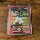 This is a Ramón Laureano 2023 Topps Chrome Magenta parallel trading card with a print run of 399. The card features Laureano in his Oakland Athletics uniform for the 2023 season. It is a sports trading card manufactured by Topps, specifically part of the Topps Chrome set. The card is ungraded and noted to be near mint or better condition, making it a desirable collectible for fans and collectors of baseball trading cards.