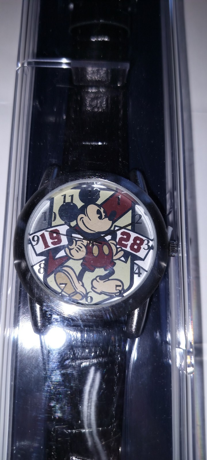 Never opened including outer sleeve, been sat in a box in a cupboard for many years. Very rare to see one being sold in the UK This limited edition Mickey Mouse wristwatch is a must-have for any Disney fan. The watch features a 12-hour dial with beige indices and a silver case colour. The round watch shape has a diameter of 30mm and is made of genuine stainless steel. The watch is water-resistant and comes with a black leather strap that is perfect for both men and women. The watch is a commemorative item from Disney and is ideal for casual wear. It features a quartz movement and was manufactured in China. The watch is never opened and comes with its original packaging. This item is perfect for collectors and Disney enthusiasts alike.