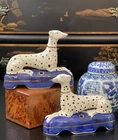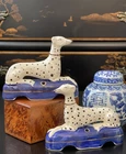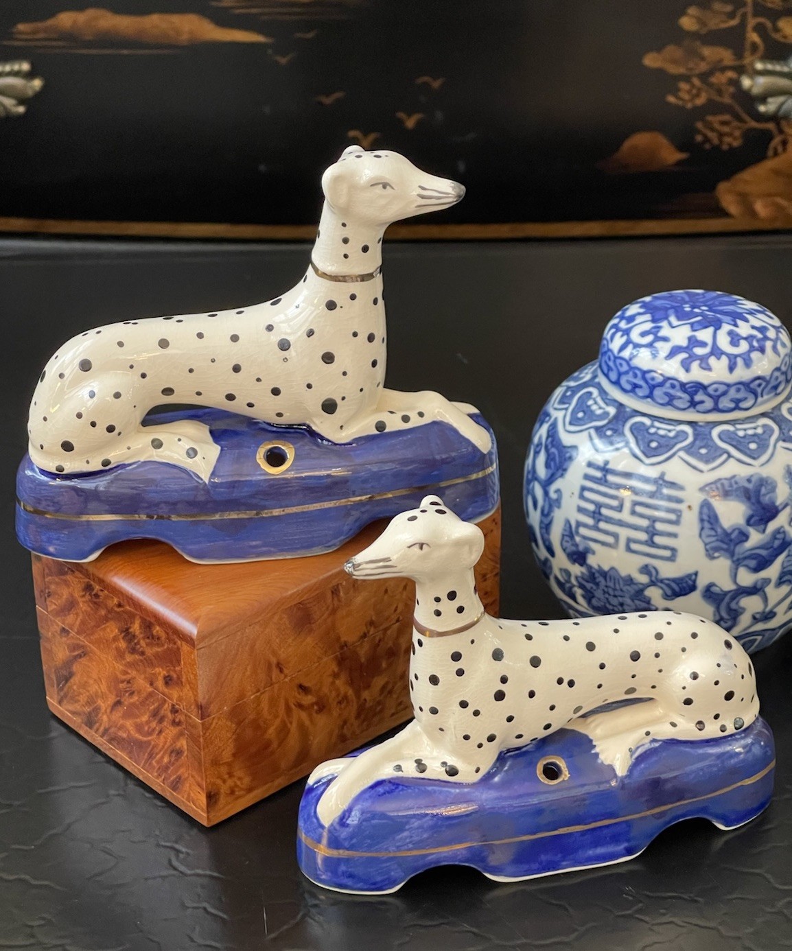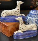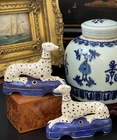 Timeless Rare 19C English Porcelain Staffordshire Dalmatian Figural Mantle Dog Pair • Length 4.75” This stunning rare 19C English Staffordshire dalmatian mantle ink well quill holder table dog pair is hand painted with spotted coats, gold aristocratic accessories and cobalt pillow base on which the figures are seated in semi-recumbent formal pose. Highly desirable and scarce with black nose and hand painted markings which are densely spotted, a nice feature to this particular pair as compared to the more commonly found markings, this elegant right and left facing pair will surely bring a touch of the English countryside to any setting in which it is placed whether paired on its own as a focal point or grouped as part of a collection or arrangement. Minimal expected age related post production wear to this beautiful rare find. Marvelous and extremely scarce surviving period example.