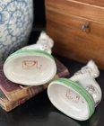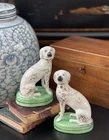 Rare Antique English Staffordshire Porcelain Figural Dalmatian Mantle Dog Pair • Rare Green Bases • Height 5.25” This regal pair of diminutive figural English Staffordshire porcelain dalmatian mantle dogs is hand painted with gilt flecked markings to coats, aristocratic accessories and exceedingly rarely seen green pillow bases on which they are seated in formal pose. Highly desirable and scarce, this elegant find will bring a touch of the English countryside to any setting in which it is placed. These matching left and right facing figures will provide balance and symmetry when paired on a mantlepiece, shelf or table and will make a stately presence on their own as a stunning focal point, or as a featured part of a fine collection or arrangement. Minimal expected characteristic post-production wear. Marvelous surviving examples. Turn of century marks to bases. Height 5.25” * Selections are shipped via UPS Southampton. The service is preferable for the safe and expeditious arrival of your purchases and care along the way.