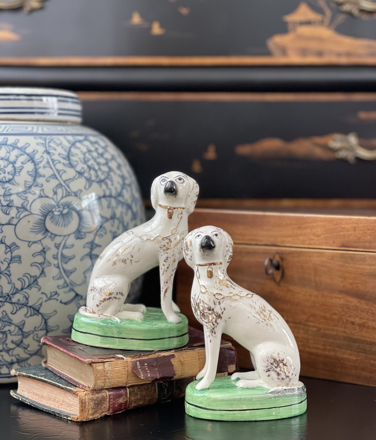 Item arrived just as described on eBay. It took a bit to receive, but it was packaged perfectly! Thank you! You wouldn’t believe how people send things and they are broken due to poor packaging. I love the Staffordshire dogs!
