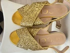 Description Brand: GUCCI Size: 35.5 EU (US 5.5), Approximately 22.5-23 cm (8.9-9.1 inches) Color: Gold Condition: Pre-owned with signs of wear on the outsole, scuffs and discoloration on the insole, minor scratches on the buckle. Glitter is generally in good condition. Material: Leather & Glitter Heel Height: Front 5 cm (2 inches), Back 6.5 cm (2.6 inches) Origin: Made in Italy Features: Gold glitter cross strap design, comfortable block heel. Thank you very much for visiting my auction. Condition: Used Please judge with a photograph. Please have a question I want to do a good deal Payment I accept PAYPAL Payoneer Please make the payment within 5 days after the end of auction. Shipping Worldwide Shipping & Duties USA : Shipped via eBay SpeedPAK Expedited . DDP (Delivered Duty Paid) : All customs duties & import taxes covered by seller. Other Countries : Shipped via Japan Post EMS Standard (4–8 days). Free Shipping . DDU (Delivered Duty Unpaid) : Buyer is responsible for customs duties & import taxes. Note : DDP = Seller pays customs duties/taxes in advance. DDU = Buyer pays customs duties/taxes upon delivery. Terms of Sale If you would like to know more about this item, please contact me before bidding. Items will be sent out within 7 business days after the payment received. When there is a different problem from the indicated contents, please tell me about it within two week. I accept returns only if items did not match the description. Buyer pays return shipping. About Us Return is accepted if only the item is different from item's description. Thank you for looking!!! International Buyers - Please Note: ・Import duties, taxes and charges are not included in the item price or shipping charges. These charges are the buyer’s responsibility. ・Please check with your country’s customs office to determine what these additional costs will be prior to bidding/buying. ・These charges are normally collected by the delivering freight (shipping) company or when you pick the item up - do not confuse them for additional shipping charges. ・We do not mark merchandise values below value or mark items as “gifts” - US and International government regulations prohibit such behavior.