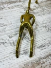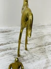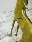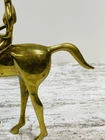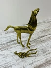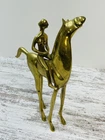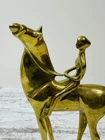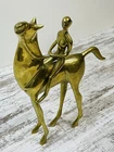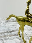 The brass sculpture depicting a woman riding a horse measures 12'' in height by 10'' in length by 2'' wide The lady is detached from her mount, which has glue on her mounting points.She sits firm when positioned right.The brass is in good condition showing an unpolished patina with some scratches present.