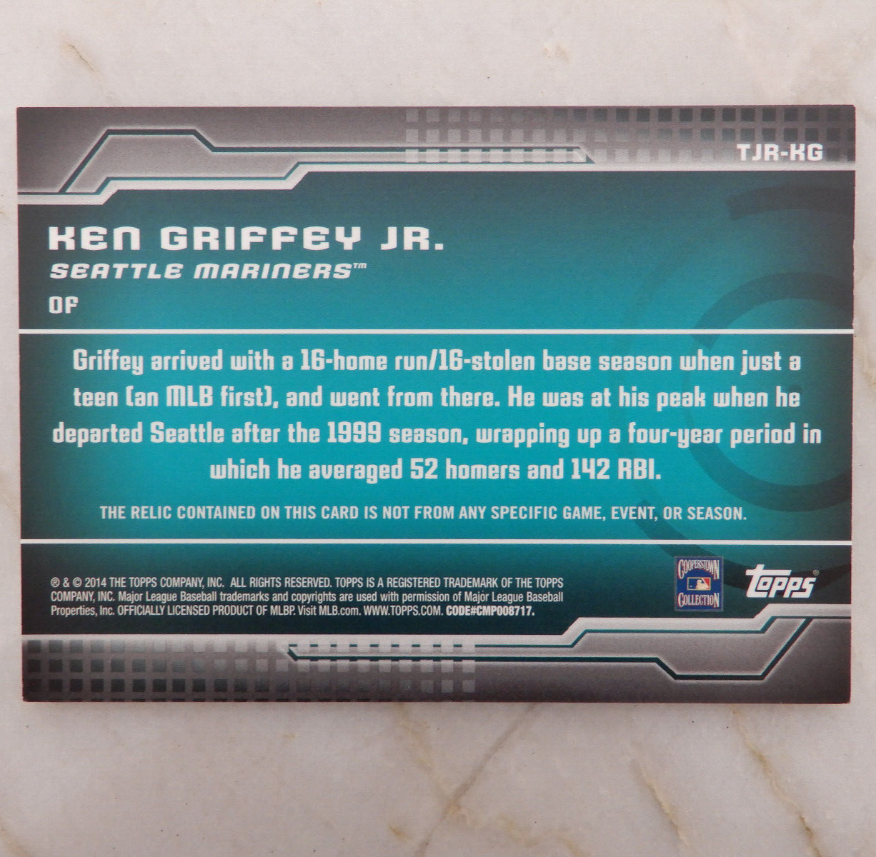 You are bidding on: Ken Griffey Jr. 2014 Topps Trajectory Jumbo Game Relic /99 - 1:2600 Packs! Please refer to images for condition. The picture is of the exact item you will receive. Shipped with USPS First Class. Please see my other auctions for more great deals on Ken Griffey Jr. and other sports cards. Let me know if you have any questions.