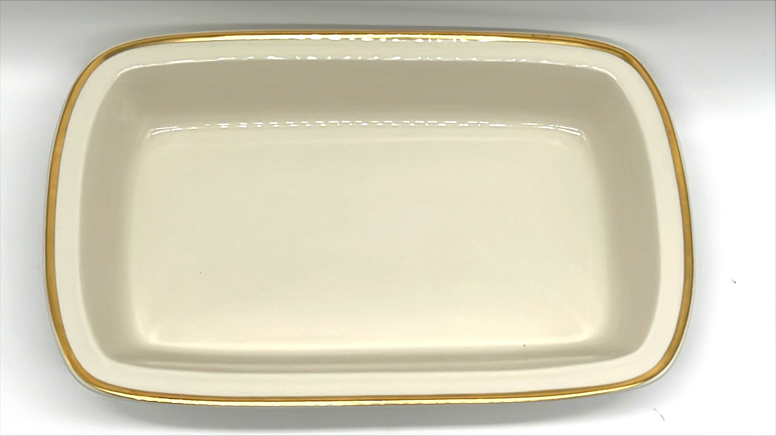 Rare Lenox Eternal Bakeware rectangle baking dish.Classic Lenox ivory Fine China and gold Trim dish.Goes from freezer to oven to table, and is also dishwasher safe.Measures 13 5/8" by 8 1/2" and 2 1/4" deep.Excellent/nearly new condition ~ very clean and shiny with no chips, cracks or crazing, and barely a scratch!Stylish dish for baking and serving.