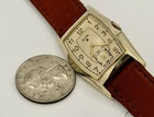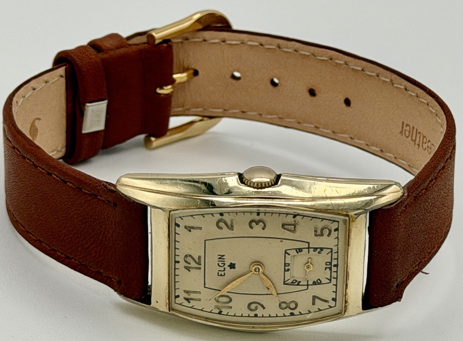 This rare men's Elgin 1930's Art Deco watch features the rare single star dial with an X movement, in near mint condition sets and runs keeping time ,new crystal and band housed in a 10k gold filled Illinois Watch case with a polished finish. The watch has a manual winding mechanical movement with 17 jewels cal.556 ref.# X74985 and a left-handed design, making it a distinct and collectible piece from the Art Deco era. With a two-piece leather strap and a classic toneau/barrel shape, this watch exudes a sense of sophistication and nostalgia for a bygone era of formal and dressy timepieces. Ideal for watch enthusiasts seeking a rare and high-quality vintage timepiece.The watch comes in a new jewelers box ready to wear or gift.Shipping is $5.00 USA.International shipping is calculated by Ebay.