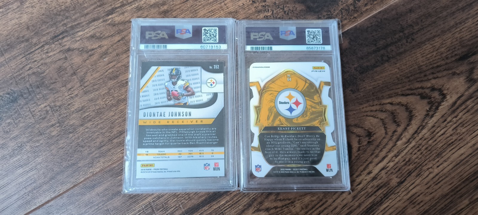 This very rare Topps 2022 foil card bundle features the Pittsburgh Steelers. The PSA 10 rating ensures high quality and authenticity, making it a valuable addition to any collection. The double bundle includes two cards, enhancing the appeal and desirability for fans and collectors alike.