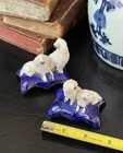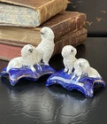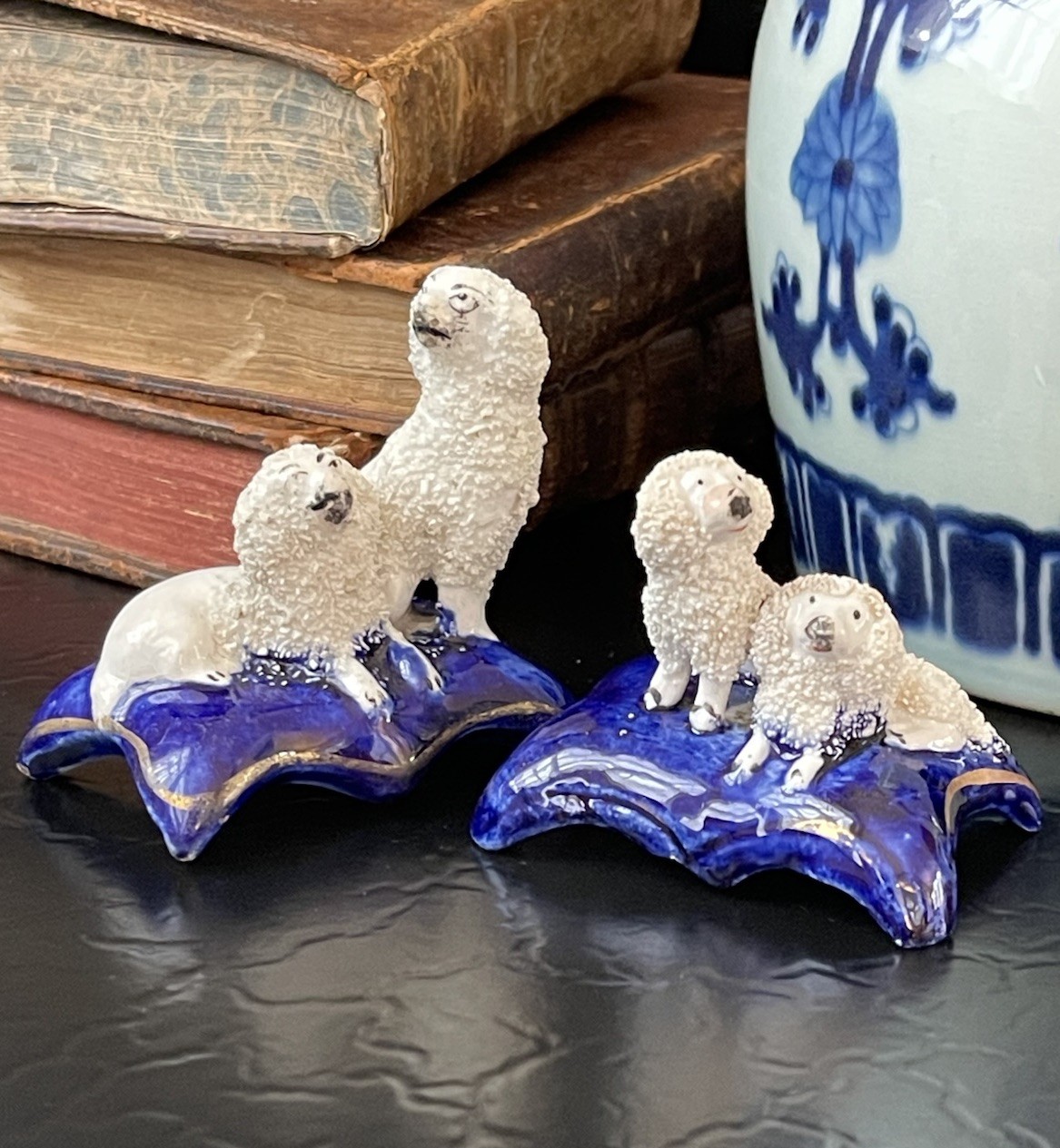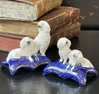 Splendid Rare 19C Early Antique Period White English Staffordshire Diminutive Figural Spaniel Mantle Dog Group Pair • Textural Coats • Extremely Rare Doubles upon One Base Pair • Base Width 2.5” • Base Length 1.75” • Height 2.5/2” • Kindly read the description below. This is a stunning and extremely scarce antique pair of diminutive English Staffordshire mantle dogs featuring textural coats in classic form and rarely found finely modelled adult spaniel pairs upon each cobalt base. Highly desirable for their timeless style and scarcity, this pair of right and left facing group figures will bring a touch of the English countryside to any setting in which they are placed when paired on their own or as part of a collection or arrangement. Rare surviving examples to own and treasure. Expected age related wear to features and the petite model has a small chip to the central base underside which includes a small portion of the cobalt central portion of decorative base. When on display this is not noticeable as it is not expected by the eye as it observes the figures, kindly view photos. Each side has slightly different modelling as well as detail work to features characteristic of early period pieces where each side may have been decorated by a different artist or factory worker, often a woman or a child. Very early scarcely seen miniature canine figural group objects created in Staffordshire England during the reign of Queen Victoria. * Listing is for white textural mantle dog pair only. Other objects are for display purposes.