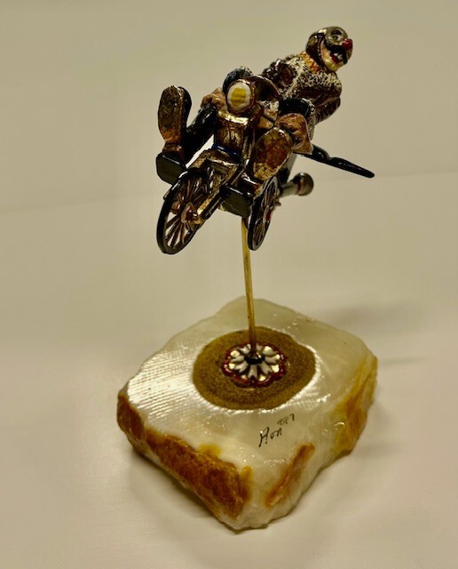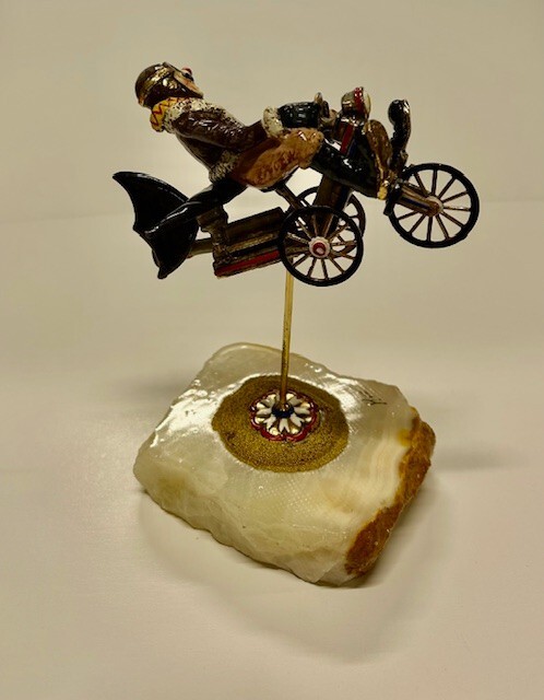 HAPPY NEW YEAR! TO CELEBRATE NOW REDUCED $40.00 TO $395.00!! THAT IS A GREAT PRICE FOR THIS RARE RON LEE CLOWN- AND FREE USA SHIPPING!!!!!! We will also supply all packaging material for free- no handling charge! This rare highly collectible unique figurine by Ron Lee features a daredevil clown riding a rocket airplane. The Base of the Sculpture is made from high-quality onyx material, and has beautiful markings. The base is also signed and dated 87'. The intricate details of the clown's costume and face, equipped with goggles is unforgettable. The Rocket Airplane's design made from a bicycle shouts volumes about this Clowns illustrious character. It a must-have for any collector of sculptures and figurines and especially of Ron Lee. The Ron Lee Clown on Bicycle Rocket Airplane is a perfect addition to any decorative collection. Its whimsical subject matter and intricate design make it a great conversation starter. Don't miss out on the opportunity to own this rare piece from the renowned Ron Lee. Approx: 8" high by 6" wide by 4.5" deep. Weight: 3.5 lbs