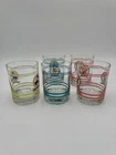 What an iconic set of glasses. Each one features a different character and color. There are stripes at the top and bottom with a character portrait in the middle. The design is featured on both sides. Glasses are sold individually. Please use the drop down menu to pick which character(s) you would like to purchase. The details: 4.25” tall 3.25” opening diameter 3” bottom diameter In excellent vintage condition. Minor wear consistent with use and age. No chips or cracks.