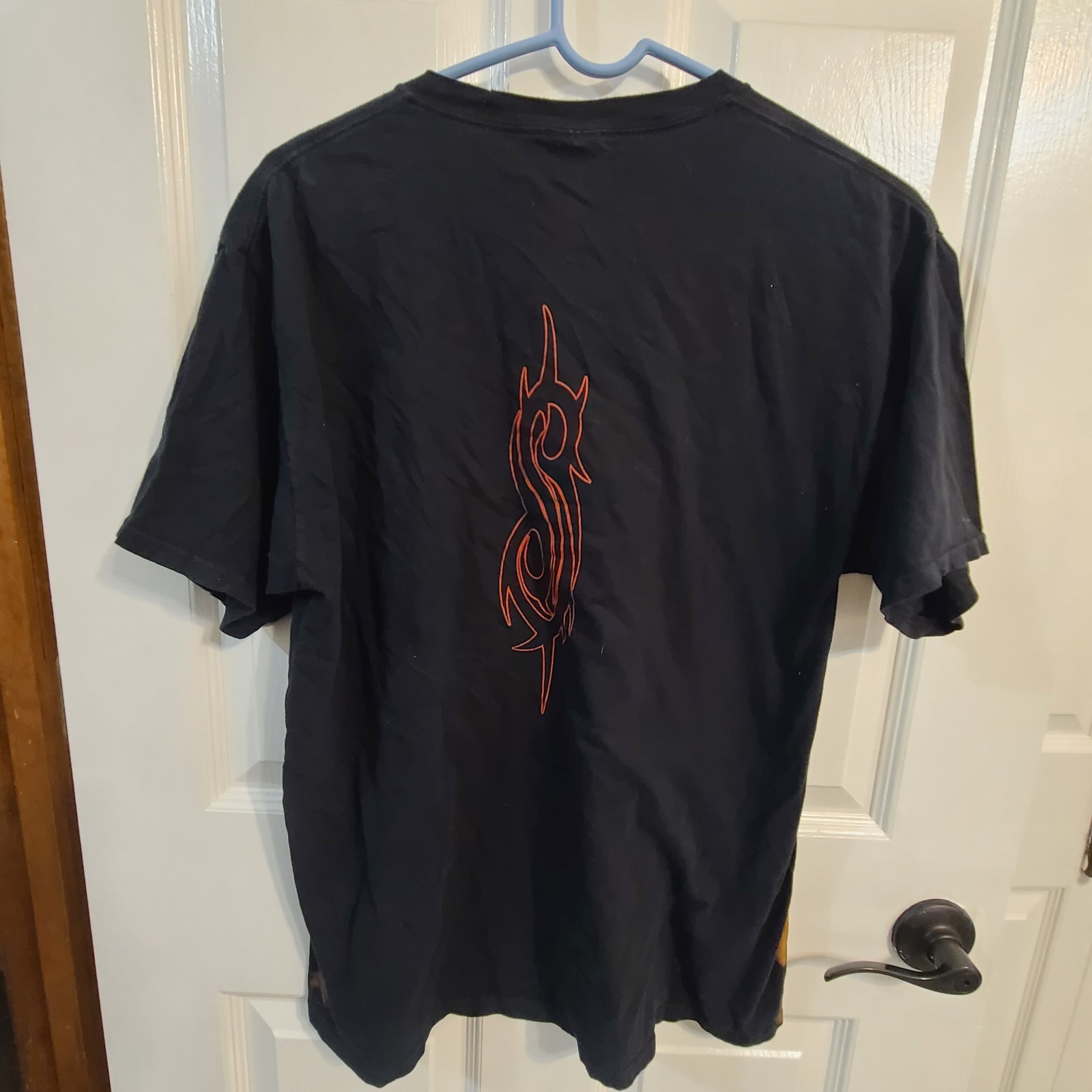 This rare vintage 1999 Slipknot t-shirt in size L is a must-have for any fan of the metal band. Made of cotton with a black color and featuring the band's logo, this t-shirt is a double-sided piece that embodies the 90s theme. The regular fit and short sleeves make it a comfortable and stylish addition to any collection, representing a piece of music history from the United States. Perfect for men who appreciate unique and nostalgic clothing items. Bleach stains as pictured in photo.
