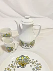 This rare vintage tea set is a true gem for collectors and tea enthusiasts alike. The set includes a teapot, creamer, lidded sugar bowl, three tea cups and 4 plates all beautifully crafted with a stunning floral pattern in shades of blue, green, and yellow. The set is made in Japan and has a glossy finish that adds to its elegance. The set is perfect for serving tea to guests or for display purposes, and it is sure to be a conversation starter. The vintage set is not handmade and is made with high-quality materials. Most likely made late 1960's early 1970's. This tea set is a must-have for anyone who is looking to add a touch of vintage charm to their collection. The teapot measures approximately 7.25" tall. The creamer measures approximately 3.5" tall. The sugar bowl measures approximately 3.25" tall. Cups are approximately 3.25" tall and 3" round. The plates are 8" round with a unique shape. They are perfect for holding your tea cup and pastries. Beautiful set that has never been used. Only for display. No chips or cracks. Very MCM!
