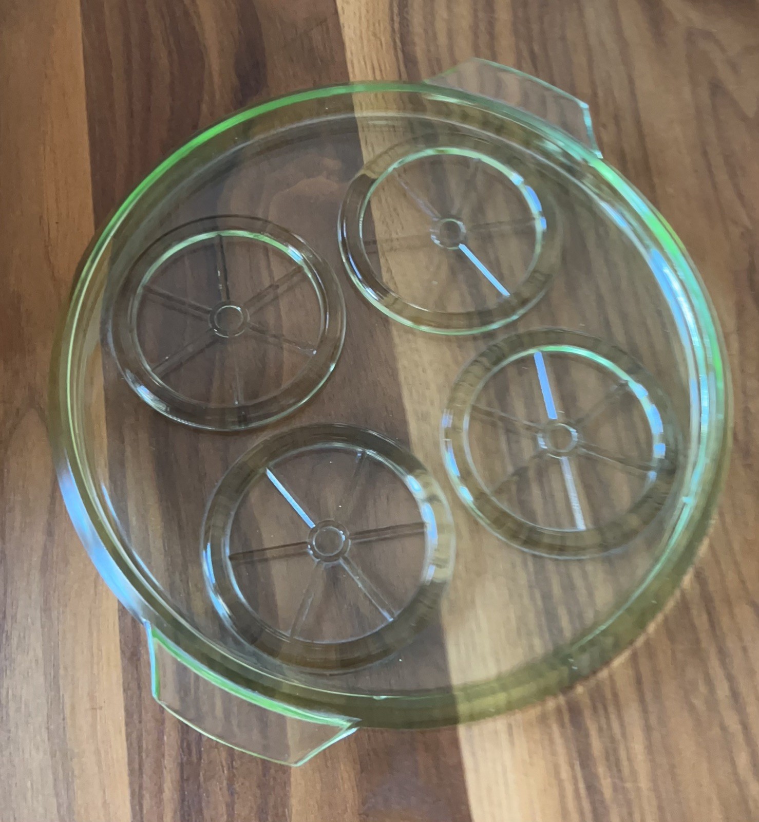 Very unique drink tray in green depression uranium glass 8.25 inches across for holding drinks. Follow me at Livefromsrq for collectibles and fashion and jewelry listings. Will be listing several other uranium pieces.