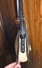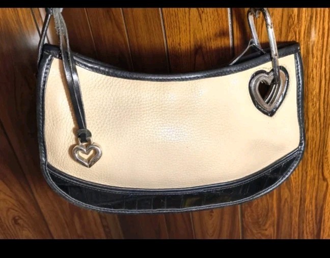 Brighton Black and white Shoulder bag, Classic Brighton Heart hardware, cute striped interior lining detail, and embossed strap. Good preowned condition some general signs of use on the interior and hardware MEASURES APPROXIMATELY HEIGHT 7" WIDTH 11.5 Needs some TLc