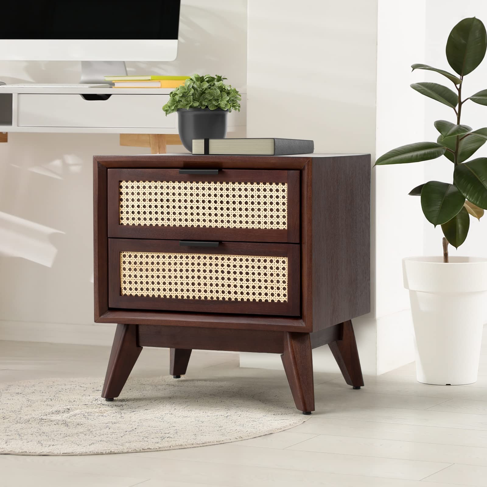 Mid-century chic goes contemporary-coastal in this beautiful accent nightstand. Black-wash wood frame encases two spacious drawers of woven cane with brass knobs, for a textural look with elegant contrast. Featuring two large drawers accented with natural rattan webbing for artistic symmetry that captivates the eye, designers love using this accent furniture in pairs to frame a bed. And, the top can accommodate some decorative objects to make a neat and ornamental statement.