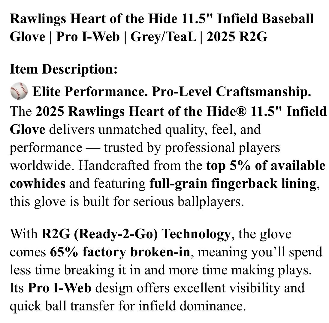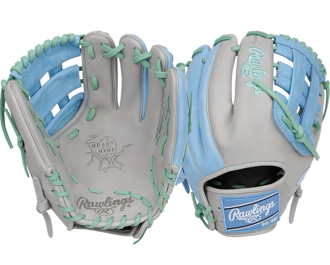 Rawlings Heart of the Hide Glove R2G ContoUR Fit 11.50" RHT Baseball Glove: PROR204-6GCB UPC # 198308015878 Official Glove of the MLB, Nolan Arenado, Bryce Harper Colors: Lt. Grey, Teal w/ Mint Green Lace Heart of the Hide Series RHT RHT: right-handed-glove: for players who throw with their right hand and catch with their left hand Listing includes Rawlings stock photos & Photos of ACTUAL item you'll receive Super FAST & FREE Shipping in USA! 100% Feedback Seller Since 2004