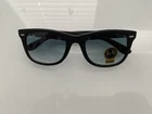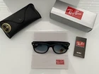 These Ray-Ban Wayfarer Ease sunglasses in black with blue lenses are a stylish choice for men looking to make a statement. The square frame design and UV protection make them both fashionable and functional. Despite a small scratch on the arm, these sunglasses are new and ready to elevate any outfit with a touch of cool sophistication.
