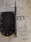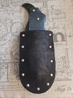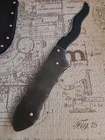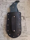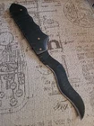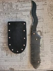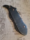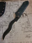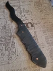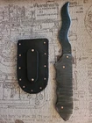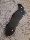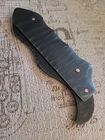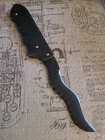 This reverse edge friction folder features all 1095 high carbon steel construction with solid copper rivets. 1/8" 1095 steel blade, handle scales and spacer. 4 3/4" single edge kris blade with 3 3/4" cutting edge. 6 1/2" closed. 10 1/2" open. Flint knapp carving on blade and handles. Cold blue finish on blade, handles and spacer. Solid copper rivets. Handcrafted vertical leather black belt sheath with hammer finish and solid copper rivets.